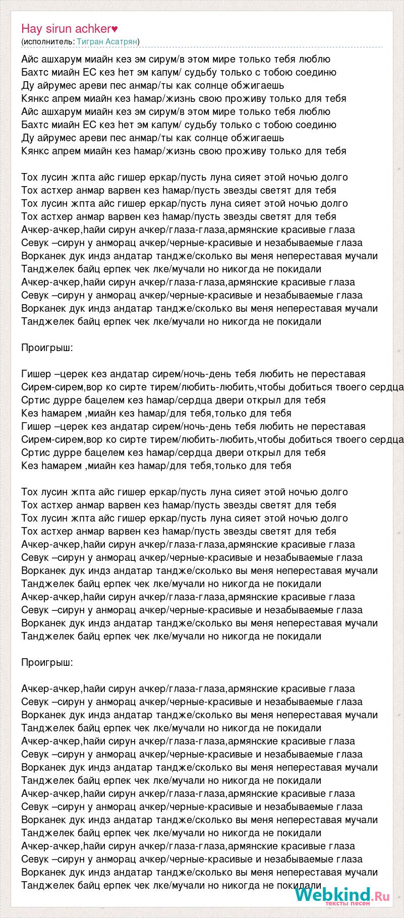 Айс ашхарум миайн кез эм сирум/в этом мире только тебя люблю Бахтс миайн ЕС кез hет эм капум/ судьбу только с тобою соединю Ду айрумес ареви пес анмар/ты как солнце обжигаешь Кянкс апрем миайн кез hамар/жизнь свою проживу только для тебя Айс ашхарум миайн кез эм сирум/в этом мире только тебя люблю Бахтс миайн ЕС кез hет эм капум/ судьбу только с тобою соединю Ду айрумес ареви пес анмар/ты как солнце обжигаешь Кянкс апрем миайн кез hамар/жизнь свою проживу только для тебя Тох лусин жпта айс гишер еркар/пусть луна сияет этой ночью долго Тох астхер анмар варвен кез hамар/пусть звезды светят для тебя Тох лусин жпта айс гишер еркар/пусть луна сияет этой ночью долго Тох астхер анмар варвен кез hамар/пусть звезды светят для тебя Ачкер-ачкер,hайи сирун ачкер/глаза-глаза,армянские красивые глаза Севук –сирун у анморац ачкер/черные-красивые и незабываемые глаза Ворканек дук индз андатар тандже/сколько вы меня непереставая мучали Танджелек байц ерпек чек лке/мучали но никогда не покидали Ачкер-ачкер,hайи сирун ачкер/глаза-глаза,армянские красивые глаза Севук –сирун у анморац ачкер/черные-красивые и незабываемые глаза Ворканек дук индз андатар тандже/сколько вы меня непереставая мучали Танджелек байц ерпек чек лке/мучали но никогда не покидали Проигрыш: Гишер –церек кез андатар сирем/ночь-день тебя любить не переставая Сирем-сирем,вор ко сирте тирем/любить-любить,чтобы добиться твоего сердца Сртис дурре бацелем кез hамар/сердца двери открыл для тебя Кез hамарем ,миайн кез hамар/для тебя,только для тебя Гишер –церек кез андатар сирем/ночь-день тебя любить не переставая Сирем-сирем,вор ко сирте тирем/любить-любить,чтобы добиться твоего сердца Сртис дурре бацелем кез hамар/сердца двери открыл для тебя Кез hамарем ,миайн кез hамар/для тебя,только для тебя Тох лусин жпта айс гишер еркар/пусть луна сияет этой ночью долго Тох астхер анмар варвен кез hамар/пусть звезды светят для тебя Тох лусин жпта айс гишер еркар/пусть луна сияет этой ночью долго Тох астхер анмар варвен кез hамар/пусть звезды светят для тебя Ачкер-ачкер,hайи сирун ачкер/глаза-глаза,армянские красивые глаза Севук –сирун у анморац ачкер/черные-красивые и незабываемые глаза Ворканек дук индз андатар тандже/сколько вы меня непереставая мучали Танджелек байц ерпек чек лке/мучали но никогда не покидали Ачкер-ачкер,hайи сирун ачкер/глаза-глаза,армянские красивые глаза Севук –сирун у анморац ачкер/черные-красивые и незабываемые глаза Ворканек дук индз андатар тандже/сколько вы меня непереставая мучали Танджелек байц ерпек чек лке/мучали но никогда не покидали Проигрыш: Ачкер-ачкер,hайи сирун ачкер/глаза-глаза,армянские красивые глаза Севук –сирун у анморац ачкер/черные-красивые и незабываемые глаза Ворканек дук индз андатар тандже/сколько вы меня непереставая мучали Танджелек байц ерпек чек лке/мучали но никогда не покидали Ачкер-ачкер,hайи сирун ачкер/глаза-глаза,армянские красивые глаза Севук –сирун у анморац ачкер/черные-красивые и незабываемые глаза Ворканек дук индз андатар тандже/сколько вы меня непереставая мучали Танджелек байц ерпек чек лке/мучали но никогда не покидали Ачкер-ачкер,hайи сирун ачкер/глаза-глаза,армянские красивые глаза Севук –сирун у анморац ачкер/черные-красивые и незабываемые глаза Ворканек дук индз андатар тандже/сколько вы меня непереставая мучали Т