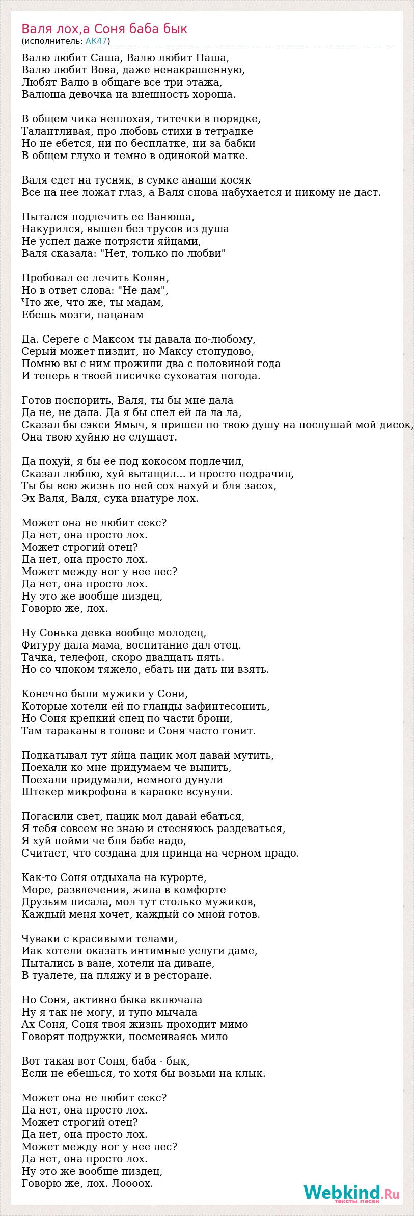 Валю любит Саша, Валю любит Паша, Валю любит Вова, даже ненакрашенную, Любят Валю в общаге все три этажа, Валюша девочка на внешность хороша. В общем чика неплохая, титечки в порядке, Талантливая, про любовь стихи в тетрадке Но не ебется, ни по бесплатке, ни за бабки В общем глухо и темно в одинокой матке. Валя едет на тусняк, в сумке анаши косяк Все на нее ложат глаз, а Валя снова набухается и никому не даст. Пытался подлечить ее Ванюша, Накурился, вышел без трусов из душа Не успел даже потрясти яйцами, Валя сказала: "Нет, только по любви" Пробовал ее лечить Колян, Но в ответ слова: "Не дам", Что же, что же, ты мадам, Ебешь мозги, пацанам Да. Сереге с Максом ты давала по-любому, Серый может пиздит, но Максу стопудово, Помню вы с ним прожили два с половиной года И теперь в твоей писичке суховатая погода. Готов поспорить, Валя, ты бы мне дала Да не, не дала. Да я бы спел ей ла ла ла, Сказал бы сэкси Ямыч, я пришел по твою душу на послушай мой дисок, Она твою хуйню не слушает. Да похуй, я бы ее под кокосом подлечил, Сказал люблю, хуй вытащил... и просто подрачил, Ты бы всю жизнь по ней сох нахуй и бля засох, Эх Валя, Валя, сука внатуре лох. Может она не любит секс? Да нет, она просто лох. Может строгий отец? Да нет, она просто лох. Может между ног у нее лес? Да нет, она просто лох. Ну это же вообще пиздец, Говорю же, лох. Ну Сонька девка вообще молодец, Фигуру дала мама, воспитание дал отец. Тачка, телефон, скоро двадцать пять. Но со чпоком тяжело, ебать ни дать ни взять. Конечно были мужики у Сони, Которые хотели ей по гланды зафинтесонить, Но Соня крепкий спец по части брони, Там тараканы в голове и Соня часто гонит. Подкатывал тут яйца пацик мол давай мутить, Поехали ко мне придумаем че выпить, Поехали придумали, немного дунули Штекер микрофона в караоке всунули. Погасили свет, пацик мол давай ебаться, Я тебя совсем не знаю и стесняюсь раздеваться, Я хуй пойми че бля бабе надо, Считает, что создана для принца на черном прадо. Как-то Соня отдыхала на курорте, Море, развлечения, жила в комфорте Друзьям писала, мол тут столько мужиков, Каждый меня хочет, каждый со мной готов. Чуваки с красивыми телами, Иак хотели оказать интимные услуги даме, Пытались в ване, хотели на диване, В туалете, на пляжу и в ресторане. Но Соня, активно быка включала Ну я так не могу, и тупо мычала Ах Соня, Соня твоя жизнь проходит мимо Говорят подружки, посмеиваясь мило Вот такая вот Соня, баба - бык, Если не ебешься, то хотя бы возьми на клык. Может она не любит секс? Да нет, она просто лох. Может строгий отец? Да нет, она просто лох. Может между ног у нее лес? Да нет, она просто лох. Ну это же вообще пиздец, Говорю же, лох. Лоооох.