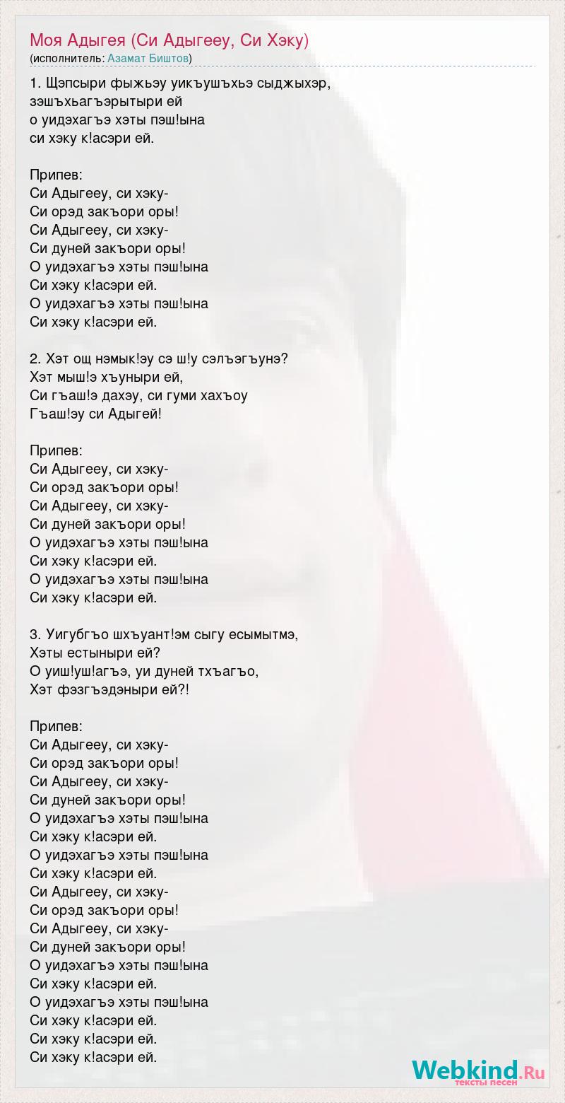 1. Щэпсыри фыжьэу уикъушъхьэ сыджыхэр, зэшъхьагъэрытыри ей о уидэхагъэ хэты пэш!ына си хэку к!асэри ей. Припев: Си Адыгееу, си хэку- Си орэд закъори оры! Си Адыгееу, си хэку- Си дуней закъори оры! О уидэхагъэ хэты пэш!ына Си хэку к!асэри ей. О уидэхагъэ хэты пэш!ына Си хэку к!асэри ей. 2. Хэт ощ нэмык!эу сэ ш!у сэлъэгъунэ? Хэт мыш!э хъуныри ей, Си гъаш!э дахэу, си гуми хахъоу Гъаш!эу си Адыгей! Припев: Си Адыгееу, си хэку- Си орэд закъори оры! Си Адыгееу, си хэку- Си дуней закъори оры! О уидэхагъэ хэты пэш!ына Си хэку к!асэри ей. О уидэхагъэ хэты пэш!ына Си хэку к!асэри ей. 3. Уигубгъо шхъуант!эм сыгу есымытмэ, Хэты естыныри ей? О уиш!уш!агъэ, уи дуней тхъагъо, Хэт фэзгъэдэныри ей?! Припев: Си Адыгееу, си хэку- Си орэд закъори оры! Си Адыгееу, си хэку- Си дуней закъори оры! О уидэхагъэ хэты пэш!ына Си хэку к!асэри ей. О уидэхагъэ хэты пэш!ына Си хэку к!асэри ей. Си Адыгееу, си хэку- Си орэд закъори оры! Си Адыгееу, си хэку- Си дуней закъори оры! О уидэхагъэ хэты пэш!ына Си хэку к!асэри ей. О уидэхагъэ хэты пэш!ына Си хэку к!асэри ей. Си хэку к!асэри ей. Си хэку к!асэри ей.