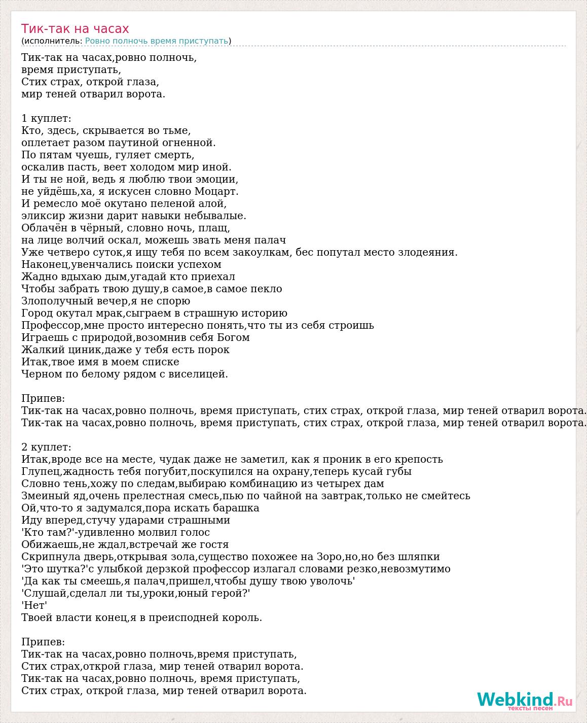 Тик-так на часах,ровно полночь, время приступать, Стих страх, открой глаза, мир теней отварил ворота. 1 куплет: Кто, здесь, скрывается во тьме, оплетает разом паутиной огненной. По пятам чуешь, гуляет смерть, оскалив пасть, веет холодом мир иной. И ты не ной, ведь я люблю твои эмоции, не уйдёшь,ха, я искусен словно Моцарт. И ремесло моё окутано пеленой алой, эликсир жизни дарит навыки небывалые. Облачён в чёрный, словно ночь, плащ, на лице волчий оскал, можешь звать меня палач Уже четверо суток,я ищу тебя по всем закоулкам, бес попутал место злодеяния. Наконец,увенчались поиски успехом Жадно вдыхаю дым,угадай кто приехал Чтобы забрать твою душу,в самое,в самое пекло Злополучный вечер,я не спорю Город окутал мрак,сыграем в страшную историю Профессор,мне просто интересно понять,что ты из себя строишь Играешь с природой,возомнив себя Богом Жалкий циник,даже у тебя есть порок Итак,твое имя в моем списке Черном по белому рядом с виселицей. Припев: Тик-так на часах,ровно полночь, время приступать, стих страх, открой глаза, мир теней отварил ворота. Тик-так на часах,ровно полночь, время приступать, стих страх, открой глаза, мир теней отварил ворота. 2 куплет: Итак,вроде все на месте, чудак даже не заметил, как я проник в его крепость Глупец,жадность тебя погубит,поскупился на охрану,теперь кусай губы Словно тень,хожу по следам,выбираю комбинацию из четырех дам Змеиный яд,очень прелестная смесь,пью по чайной на завтрак,только не смейтесь Ой,что-то я задумался,пора искать барашка Иду вперед,стучу ударами страшными 'Кто там?'-удивленно молвил голос Обижаешь,не ждал,встречай же гостя Скрипнула дверь,открывая зола,существо похожее на Зоро,но,но без шляпки 'Это шутка?'с улыбкой дерзкой профессор излагал словами резко,невозмутимо 'Да как ты смеешь,я палач,пришел,чтобы душу твою уволочь' 'Слушай,сделал ли ты,уроки,юный герой?' 'Нет' Твоей власти конец,я в преисподней король. Припев: Тик-так на часах,ровно полночь,время приступать, Стих страх,открой глаза, мир теней отварил ворота. Тик-так на часах,ровно полночь, время приступать, Стих страх, открой глаза, мир теней отварил ворота.