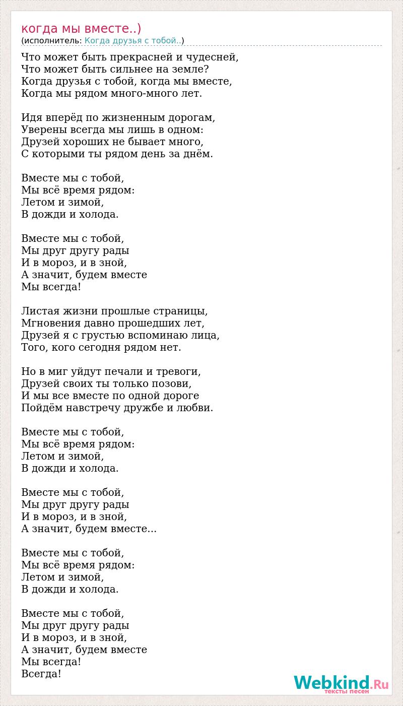 Что может быть прекрасней и чудесней, Что может быть сильнее на земле? Когда друзья с тобой, когда мы вместе, Когда мы рядом много-много лет. Идя вперёд по жизненным дорогам, Уверены всегда мы лишь в одном: Друзей хороших не бывает много, С которыми ты рядом день за днём. Вместе мы с тобой, Мы всё время рядом: Летом и зимой, В дожди и холода. Вместе мы с тобой, Мы друг другу рады И в мороз, и в зной, А значит, будем вместе Мы всегда! Листая жизни прошлые страницы, Мгновения давно прошедших лет, Друзей я с грустью вспоминаю лица, Того, кого сегодня рядом нет. Но в миг уйдут печали и тревоги, Друзей своих ты только позови, И мы все вместе по одной дороге Пойдём навстречу дружбе и любви. Вместе мы с тобой, Мы всё время рядом: Летом и зимой, В дожди и холода. Вместе мы с тобой, Мы друг другу рады И в мороз, и в зной, А значит, будем вместе... Вместе мы с тобой, Мы всё время рядом: Летом и зимой, В дожди и холода. Вместе мы с тобой, Мы друг другу рады И в мороз, и в зной, А значит, будем вместе Мы всегда! Всегда!