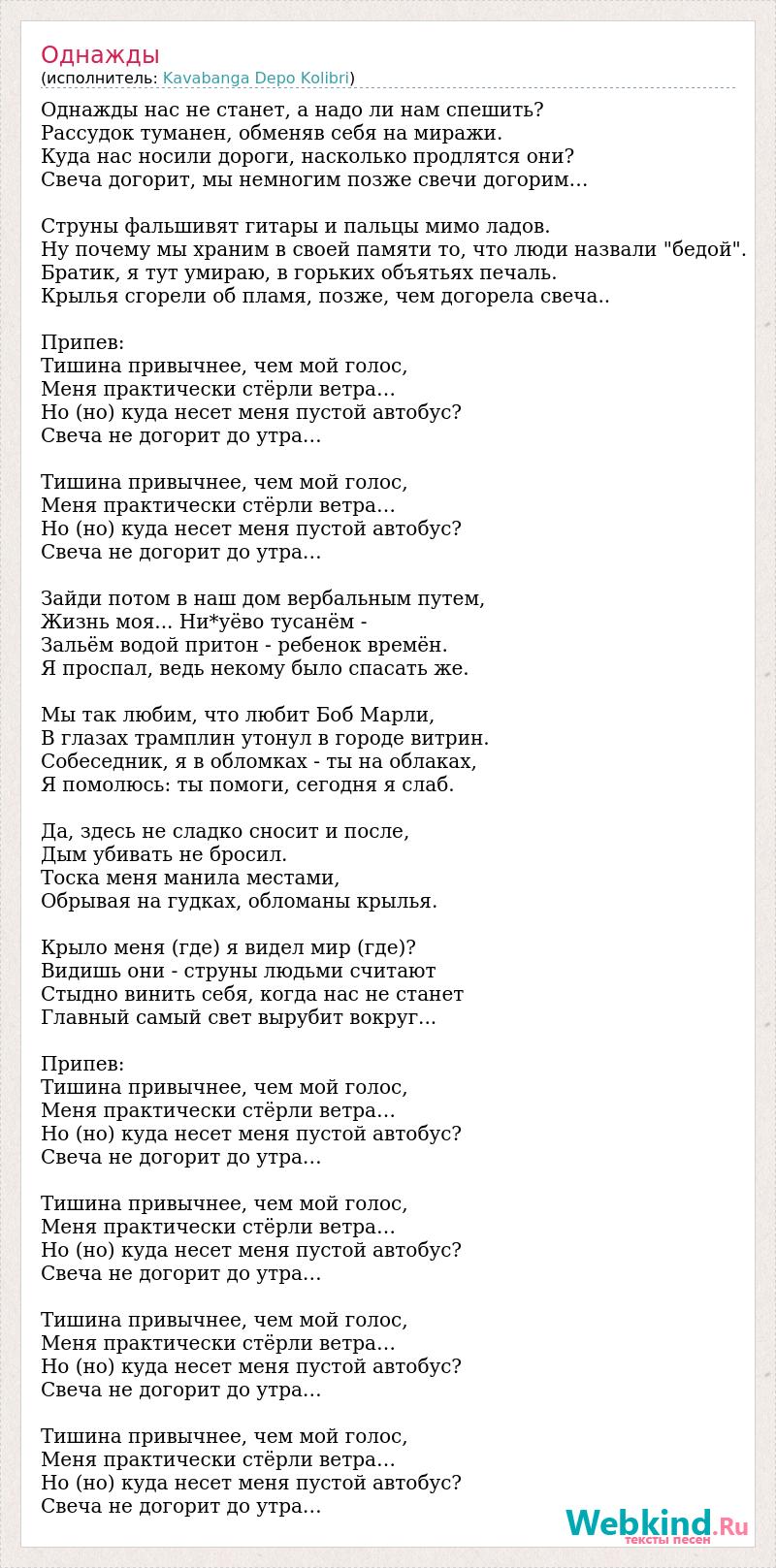 Однажды нас не станет, а надо ли нам спешить? Рассудок туманен, обменяв себя на миражи. Куда нас носили дороги, насколько продлятся они? Свеча догорит, мы немногим позже свечи догорим… Струны фальшивят гитары и пальцы мимо ладов. Ну почему мы храним в своей памяти то, что люди назвали "бедой". Братик, я тут умираю, в горьких объятьях печаль. Крылья сгорели об пламя, позже, чем догорела свеча.. Припев: Тишина привычнее, чем мой голос, Меня практически стёрли ветра… Но (но) куда несет меня пустой автобус? Свеча не догорит до утра… Тишина привычнее, чем мой голос, Меня практически стёрли ветра… Но (но) куда несет меня пустой автобус? Свеча не догорит до утра… Зайди потом в наш дом вербальным путем, Жизнь моя... Ни*уёво тусанём - Зальём водой притон - ребенок времён. Я проспал, ведь некому было спасать же. Мы так любим, что любит Боб Марли, В глазах трамплин утонул в городе витрин. Собеседник, я в обломках - ты на облаках, Я помолюсь: ты помоги, сегодня я слаб. Да, здесь не сладко сносит и после, Дым убивать не бросил. Тоска меня манила местами, Обрывая на гудках, обломаны крылья. Крыло меня (где) я видел мир (где)? Видишь они - струны людьми считают Стыдно винить себя, когда нас не станет Главный самый свет вырубит вокруг... Припев: Тишина привычнее, чем мой голос, Меня практически стёрли ветра… Но (но) куда несет меня пустой автобус? Свеча не догорит до утра… Тишина привычнее, чем мой голос, Меня практически стёрли ветра… Но (но) куда несет меня пустой автобус? Свеча не догорит до утра… Тишина привычнее, чем мой голос, Меня практически стёрли ветра… Но (но) куда несет меня пустой автобус? Свеча не догорит до утра… Тишина привычнее, чем мой голос, Меня практически стёрли ветра… Но (но) куда несет меня пустой автобус? Свеча не догорит до утра…