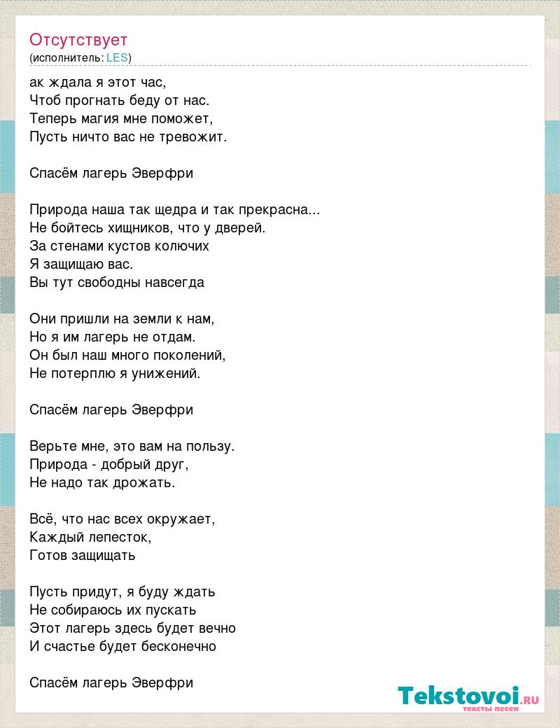 ак ждала я этот час, Чтоб прогнать беду от нас. Теперь магия мне поможет, Пусть ничто вас не тревожит. Спасём лагерь Эверфри Природа наша так щедра и так прекрасна... Не бойтесь хищников, что у дверей. За стенами кустов колючих Я защищаю вас. Вы тут свободны навсегда Они пришли на земли к нам, Но я им лагерь не отдам. Он был наш много поколений, Не потерплю я унижений. Спасём лагерь Эверфри Верьте мне, это вам на пользу. Природа - добрый друг, Не надо так дрожать. Всё, что нас всех окружает, Каждый лепесток, Готов защищать Пусть придут, я буду ждать Не собираюсь их пускать Этот лагерь здесь будет вечно И счастье будет бесконечно Спасём лагерь Эверфри