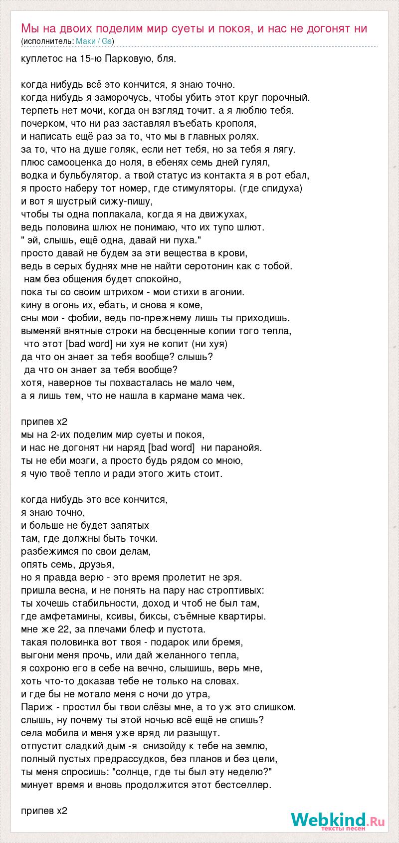 куплетос на 15-ю Парковую, бля. когда нибудь всё это кончится, я знаю точно. когда нибудь я заморочусь, чтобы убить этот круг порочный. терпеть нет мочи, когда он взгляд точит. а я люблю тебя. почерком, что ни раз заставлял въебать крополя, и написать ещё раз за то, что мы в главных ролях. за то, что на душе голяк, если нет тебя, но за тебя я лягу. плюс самооценка до ноля, в ебенях семь дней гулял, водка и бульбулятор. а твой статус из контакта я в рот ебал, я просто наберу тот номер, где стимуляторы. (где спидуха) и вот я шустрый сижу-пишу, чтобы ты одна поплакала, когда я на движухах, ведь половина шлюх не понимаю, что их тупо шлют. " эй, слышь, ещё одна, давай ни пуха." просто давай не будем за эти вещества в крови, ведь в серых буднях мне не найти серотонин как с тобой. нам без общения будет спокойно, пока ты со своим штрихом - мои стихи в агонии. кину в огонь их, ебать, и снова я коме, сны мои - фобии, ведь по-прежнему лишь ты приходишь. выменяй внятные строки на бесценные копии того тепла, что этот [bad word] ни хуя не копит (ни хуя) да что он знает за тебя вообще? слышь? да что он знает за тебя вообще? хотя, наверное ты похвасталась не мало чем, а я лишь тем, что не нашла в кармане мама чек. припев х2 мы на 2-их поделим мир суеты и покоя, и нас не догонят ни наряд [bad word] ни паранойя. ты не еби мозги, а просто будь рядом со мною, я чую твоё тепло и ради этого жить стоит. когда нибудь это все кончится, я знаю точно, и больше не будет запятых там, где должны быть точки. разбежимся по свои делам, опять семь, друзья, но я правда верю - это время пролетит не зря. пришла весна, и не понять на пару нас строптивых: ты хочешь стабильности, доход и чтоб не был там, где амфетамины, ксивы, биксы, съёмные квартиры. мне же 22, за плечами блеф и пустота. такая половинка вот твоя - подарок или бремя, выгони меня прочь, или дай желанного тепла, я сохроню его в себе на вечно, слышишь, верь мне, хоть что-то доказав тебе не только на словах. и где бы не мотало меня с ночи до утра, Париж - простил бы твои слёзы мне, а то уж это слишком. слышь, ну почему ты этой ночью всё ещё не спишь? села мобила и меня уже вряд ли разыщут. отпустит сладкий дым -я снизойду к тебе на землю, полный пустых предрассудков, без планов и без цели, ты меня спросишь: "солнце, где ты был эту неделю?" минует время и вновь продолжится этот бестселлер. припев х2