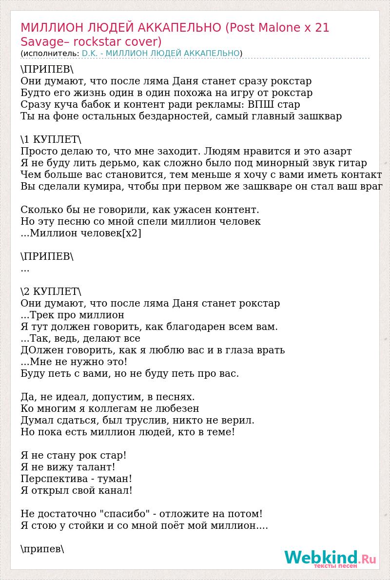 \ПРИПЕВ\ Они думают, что после ляма Даня станет сразу рокстар Будто его жизнь один в один похожа на игру от рокстар Сразу куча бабок и контент ради рекламы: ВПШ стар Ты на фоне остальных бездарностей, самый главный зашквар \1 КУПЛЕТ\ Просто делаю то, что мне заходит. Людям нравится и это азарт Я не буду лить дерьмо, как сложно было под минорный звук гитар Чем больше вас становится, тем меньше я хочу с вами иметь контакт Вы сделали кумира, чтобы при первом же зашкваре он стал ваш враг Сколько бы не говорили, как ужасен контент. Но эту песню со мной спели миллион человек ...Миллион человек[x2] \ПРИПЕВ\ ... \2 КУПЛЕТ\ Они думают, что после ляма Даня станет рокстар ...Трек про миллион Я тут должен говорить, как благодарен всем вам. ...Так, ведь, делают все ДОлжен говорить, как я люблю вас и в глаза врать ...Мне не нужно это! Буду петь с вами, но не буду петь про вас. Да, не идеал, допустим, в песнях. Ко многим я коллегам не любезен Думал сдаться, был труслив, никто не верил. Но пока есть миллион людей, кто в теме! Я не стану рок стар! Я не вижу талант! Перспектива - туман! Я открыл свой канал! Не достаточно "спасибо" - отложите на потом! Я стою у стойки и со мной поёт мой миллион.... \припев\