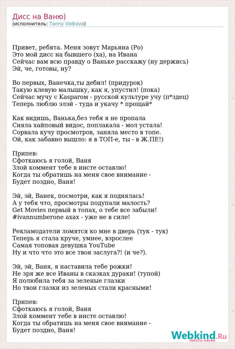 Привет, ребята. Меня зовут Марьяна (Ро) Это мой дисс на бывшего (ха), на Ивана Сейчас вам всю правду о Ваньке расскажу (ну держись) Эй, че, готовы, ну? Во первых, Ванечка,ты дебил! (придурок) Такую клевую малышку, как я, упустил! (пока) Сейчас мучу с Kasparом - русской культуре учу (п*здец) Теперь люблю элэй - туда и укачу * прощай* Как видишь, Ванька,без тебя я не пропала Сняла хайповый видос, поплакала - мол устала! Сорвала кучу просмотров, заняла место в топе. Ой, как забавно вышло: я в ТОП-е, ты - в Ж.ПЕ!) Припев: Сфоткаюсь я голой, Ваня Злой коммент тебе в инсте оставлю! Когда ты обратишь на меня свое внимание - Будет поздно, Ваня! Эй, эй, Ванек, посмотри, как я поднялась! А у тебя что, просмотры подупали малость? Get Movies первый в топах, о тебе все забыли! #ivannumberone ахах - уже не в силе! Рекламодатели ломятся ко мне в дверь (тук - тук) Теперь я стала круче, умнее, взрослее Самая топовая девушка YouTube Ну и что что это все твоя заслуга?! (и че?). Эй, эй, Ваня, я наставила тебе рожки! Не зря же все Иваны в сказках дураки! (тупой) Я полюбила тебя за зеленые глазки Но твои глазки из зеленых стали красными! Припев: Сфоткаюсь я голой, Ваня Злой коммент тебе в инсте оставлю! Когда ты обратишь на меня свое внимание - Будет поздно, Ваня!