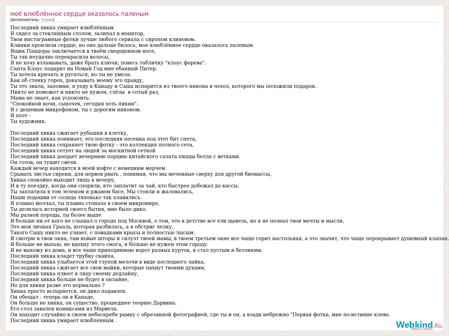 Последний хикка умирает влюблённым. Я сидел за стеклянным столом, залипал в монитор, Твои инстаграмные фотки лучше любого сериала с сиропом клиновом. Клинки пронзили сердце, но оно дальше билось, мое влюблённое сердце оказалось паленым. Ящик Пандоры заключается в твоём сморщенном носе, Ты так неудачно перекрасила волосы, Я не хочу взламывать, даже брать ключи, повесь табличку "клоус форева". Санта Клаус подарит на Новый Год мне ебанный Питер. Ты хотела кричать и ругаться, но ты не умела. Как об стенку горох, доказывать моему эго правду, Ты это знала, запомни, я уеду в Канаду и Саша испарится из твоего никона в чехол, которого мы положили подарок. Никто не поможет и никто не нужен, слёзы в сотый раз, Мама не знает, как успокоить: "Спокойной ночи, сыночек, сегодня хоть пикни". Я с дешевым микрофоном, ты с дорогим никоном. Я поэт - Ты художник. Последний хикка сжигает рубашки в клетку, Последний хикка понимает, его последняя песенка под этот бит спета, Последний хикка сохраняет твою фотку - это коллекция полного сета, Последний хикка сетует на людей за москитной сеткой Последний хикка доедает вечернюю порцию китайского салата пиццы белла с ветками. Он готов, он тушит свечи. Каждый вечер находится в моей кофте с немецким мерчем. Срывать листья сирени, для нервов рвать , понимая, что мы меченные сверху для другой биомассы, Хикка спокойно выходит лишь к вечеру, И в ту поездку, когда они спорили, кто заплатит за чай, кто быстрее добежал до кассы. Ты заплатила в том зеленом и ржавом басе, Мы стояли и жаловались, Наши подошви от солнца тихонько так плавились. Я плавно молчал, ты плавно стонала в своем микромире, Ты делилась историей своего бытия, мне было дико. Мы разной породы, ты более выше Я больше ни от кого не слышал о городе под Москвой, о том, что в детстве все ели щавель, но я не познал твои мечты и мысли. Это моя личная Грааль, которая разбилась, а я обстриг челку, Такого Сашу никто не узнает, с повадками крысы и полностью лысым. Я смотрю в твои окна, там новые шторы и силуэт твоей мамы, в твоем третьем окне все чаще горит настольная, а это значит, что чаще перекрывает душевный клапан. Я больше не выпью, не вдохну этого смога, я больше не нужен этом городу. Я не выхожу из дома, и все чаще приподнимаю ворот разных курток, я стал пустым и безликим. Последний хикка кладет трубку скайпа, Последний хикка улыбается этой глупой мелочи в виде последнего лайка, Последний хикка сжигает все свои майки, которые пахнут твоими духами, Последний хикка плюет в лицу своему дедлайну, Последний хикка больше не будет в онлайне, Но для хикки разве это нормально ? Хикка просто испаряется, он дико подавлен. Он обещал - теперь он в Канаде, Он больше не хикка, он существо, прошедшее теорию Дарвина. Его стол завален комиксами из Марвела. Он находит случайно в своем небоскребе рамку с обрезанной фотографией, где ты и он, а взади небрежно "Первая фотка, мне по-истинне клево. Последний хикка умирает влюбленным.