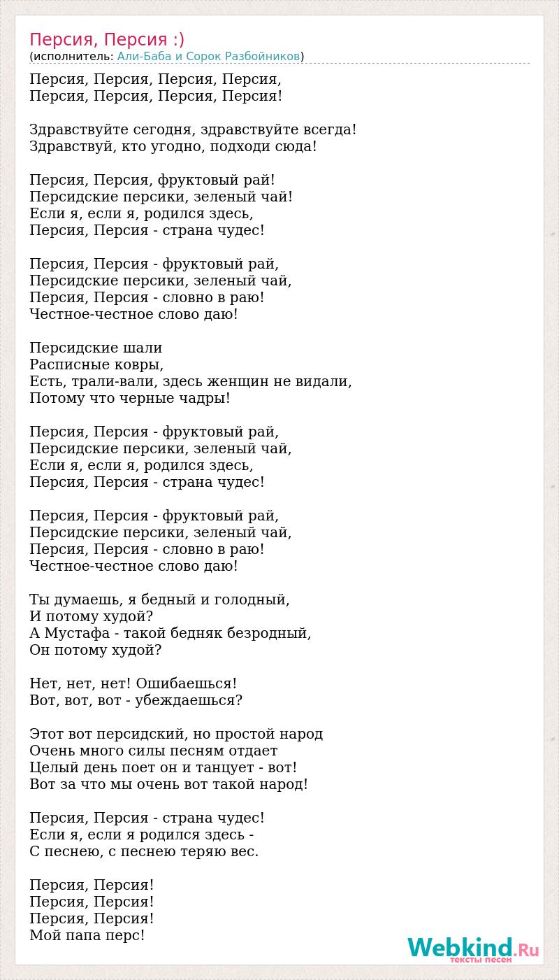 Персия, Персия, Персия, Персия, Персия, Персия, Персия, Персия! Здравствуйте сегодня, здравствуйте всегда! Здравствуй, кто угодно, подходи сюда! Персия, Персия, фруктовый рай! Персидские персики, зеленый чай! Если я, если я, родился здесь, Персия, Персия - страна чудес! Персия, Персия - фруктовый рай, Персидские персики, зеленый чай, Персия, Персия - словно в раю! Честное-честное слово даю! Персидские шали Расписные ковры, Есть, трали-вали, здесь женщин не видали, Потому что черные чадры! Персия, Персия - фруктовый рай, Персидские персики, зеленый чай, Если я, если я, родился здесь, Персия, Персия - страна чудес! Персия, Персия - фруктовый рай, Персидские персики, зеленый чай, Персия, Персия - словно в раю! Честное-честное слово даю! Ты думаешь, я бедный и голодный, И потому худой? А Мустафа - такой бедняк безродный, Он потому худой? Нет, нет, нет! Ошибаешься! Вот, вот, вот - убеждаешься? Этот вот персидский, но простой народ Очень много силы песням отдает Целый день поет он и танцует - вот! Вот за что мы очень вот такой народ! Персия, Персия - страна чудес! Если я, если я родился здесь - С песнею, с песнею теряю вес. Персия, Персия! Персия, Персия! Персия, Персия! Мой папа перс!