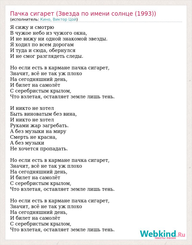 Я сижу и смотрю В чужое небо из чужого окна, И не вижу ни одной знакомой звезды. Я ходил по всем дорогам И туда и сюда, обернулся И не смог разглядеть следы. Но если есть в кармане пачка сигарет, Значит, всё не так уж плохо На сегодняшний день, И билет на самолёт С серебристым крылом, Что взлетая, оставляет земле лишь тень. И никто не хотел Быть виноватым без вина, И никто не хотел Руками жар загребать. А без музыки на миру Смерть не красна, А без музыки Не хочется пропадать. Но если есть в кармане пачка сигарет, Значит, всё не так уж плохо На сегодняшний день, И билет на самолёт С серебристым крылом, Что взлетая, оставляет земле лишь тень. Но если есть в кармане пачка сигарет, Значит, всё не так уж плохо На сегодняшний день, И билет на самолёт С серебристым крылом, Что взлетая, оставляет земле лишь тень.