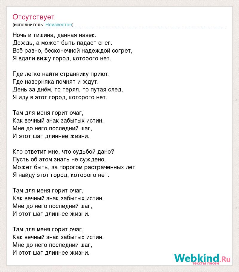Ночь и тишина, данная навек. Дождь, а может быть падает снег. Всё равно, бесконечной надеждой согрет, Я вдали вижу город, которого нет. Где легко найти страннику приют. Где наверняка помнят и ждут. День за днём, то теряя, то путая след, Я иду в этот город, которого нет. Там для меня горит очаг, Как вечный знак забытых истин. Мне до него последний шаг, И этот шаг длиннее жизни. Кто ответит мне, что судьбой дано? Пусть об этом знать не суждено. Может быть, за порогом растраченных лет Я найду этот город, которого нет. Там для меня горит очаг, Как вечный знак забытых истин. Мне до него последний шаг, И этот шаг длиннее жизни. Там для меня горит очаг, Как вечный знак забытых истин. Мне до него последний шаг, И этот шаг длиннее жизни.