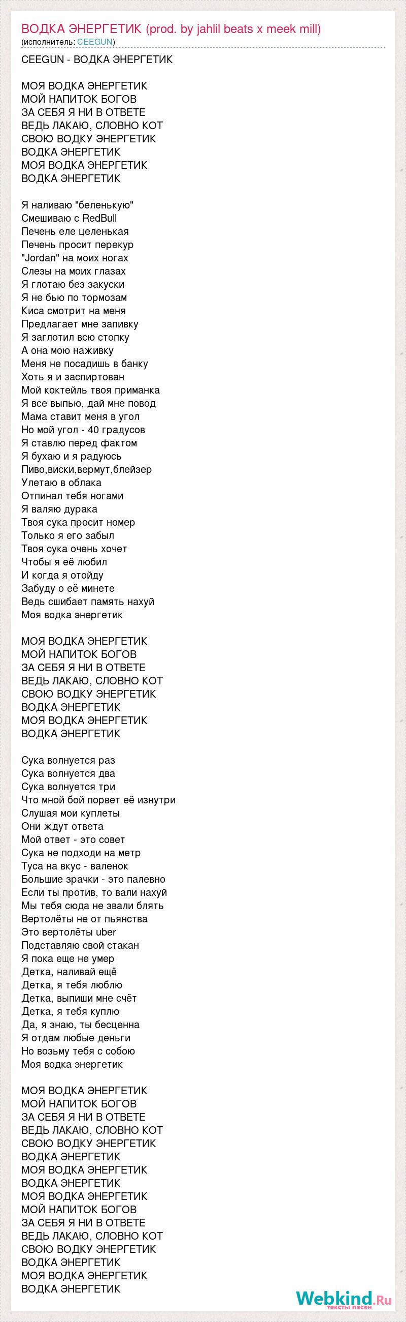 CEEGUN - ВОДКА ЭНЕРГЕТИК МОЯ ВОДКА ЭНЕРГЕТИК МОЙ НАПИТОК БОГОВ ЗА СЕБЯ Я НИ В ОТВЕТЕ ВЕДЬ ЛАКАЮ, СЛОВНО КОТ СВОЮ ВОДКУ ЭНЕРГЕТИК ВОДКА ЭНЕРГЕТИК МОЯ ВОДКА ЭНЕРГЕТИК ВОДКА ЭНЕРГЕТИК Я наливаю "беленькую" Смешиваю с RedBull Печень еле целенькая Печень просит перекур "Jordan" на моих ногах Слезы на моих глазах Я глотаю без закуски Я не бью по тормозам Киса смотрит на меня Предлагает мне запивку Я заглотил всю стопку А она мою наживку Меня не посадишь в банку Хоть я и заспиртован Мой коктейль твоя приманка Я все выпью, дай мне повод Мама ставит меня в угол Но мой угол - 40 градусов Я ставлю перед фактом Я бухаю и я радуюсь Пиво,виски,вермут,блейзер Улетаю в облака Отпинал тебя ногами Я валяю дурака Твоя сука просит номер Только я его забыл Твоя сука очень хочет Чтобы я её любил И когда я отойду Забуду о её минете Ведь сшибает память нахуй Моя водка энергетик МОЯ ВОДКА ЭНЕРГЕТИК МОЙ НАПИТОК БОГОВ ЗА СЕБЯ Я НИ В ОТВЕТЕ ВЕДЬ ЛАКАЮ, СЛОВНО КОТ СВОЮ ВОДКУ ЭНЕРГЕТИК ВОДКА ЭНЕРГЕТИК МОЯ ВОДКА ЭНЕРГЕТИК ВОДКА ЭНЕРГЕТИК Сука волнуется раз Сука волнуется два Сука волнуется три Что мной бой порвет её изнутри Слушая мои куплеты Они ждут ответа Мой ответ - это совет Сука не подходи на метр Туса на вкус - валенок Большие зрачки - это палевно Если ты против, то вали нахуй Мы тебя сюда не звали блять Вертолёты не от пьянства Это вертолёты uber Подставляю свой стакан Я пока еще не умер Детка, наливай ещё Детка, я тебя люблю Детка, выпиши мне счёт Детка, я тебя куплю Да, я знаю, ты бесценна Я отдам любые деньги Но возьму тебя с собою Моя водка энергетик МОЯ ВОДКА ЭНЕРГЕТИК МОЙ НАПИТОК БОГОВ ЗА СЕБЯ Я НИ В ОТВЕТЕ ВЕДЬ ЛАКАЮ, СЛОВНО КОТ СВОЮ ВОДКУ ЭНЕРГЕТИК ВОДКА ЭНЕРГЕТИК МОЯ ВОДКА ЭНЕРГЕТИК ВОДКА ЭНЕРГЕТИК МОЯ ВОДКА ЭНЕРГЕТИК МОЙ НАПИТОК БОГОВ ЗА СЕБЯ Я НИ В ОТВЕТЕ ВЕДЬ ЛАКАЮ, СЛОВНО КОТ СВОЮ ВОДКУ ЭНЕРГЕТИК ВОДКА ЭНЕРГЕТИК МОЯ ВОДКА ЭНЕРГЕТИК ВОДКА ЭНЕРГЕТИК