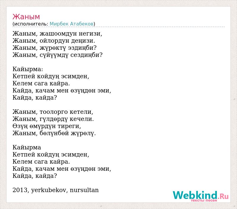 Жаным, жашоомдун негизи, Жаным, ойлордун деңизи. Жаным, жүрөктү эздиңби? Жаным, сүйүүмдү сездиңби? Кайырма: Кетпей койдуң эсимден, Келем сага кайра. Кайда, качам мен өзүңдөн эми, Кайда, кайда? Жаным, тоолорго кетели, Жаным, гүлдөрдү кечели. Өзүң өмүрдүн тиреги, Жаным, бөлүнбөй жүрөлү. Кайырма Кетпей койдуң эсимден, Келем сага кайра. Кайда, качам мен өзүңдөн эми, Кайда, кайда? 2013, yerkubekov, nursultan