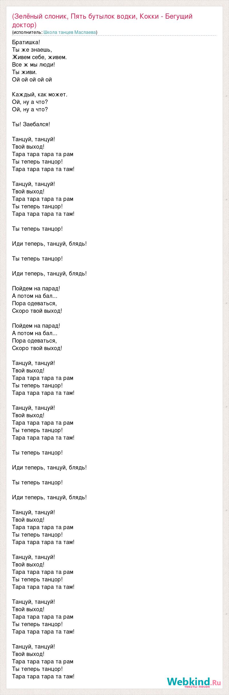 Главная→Исполнители→Школа танцев Маслаева→(Зелёный слоник, Пять бутылок водки, Кокки - Бегущий доктор)