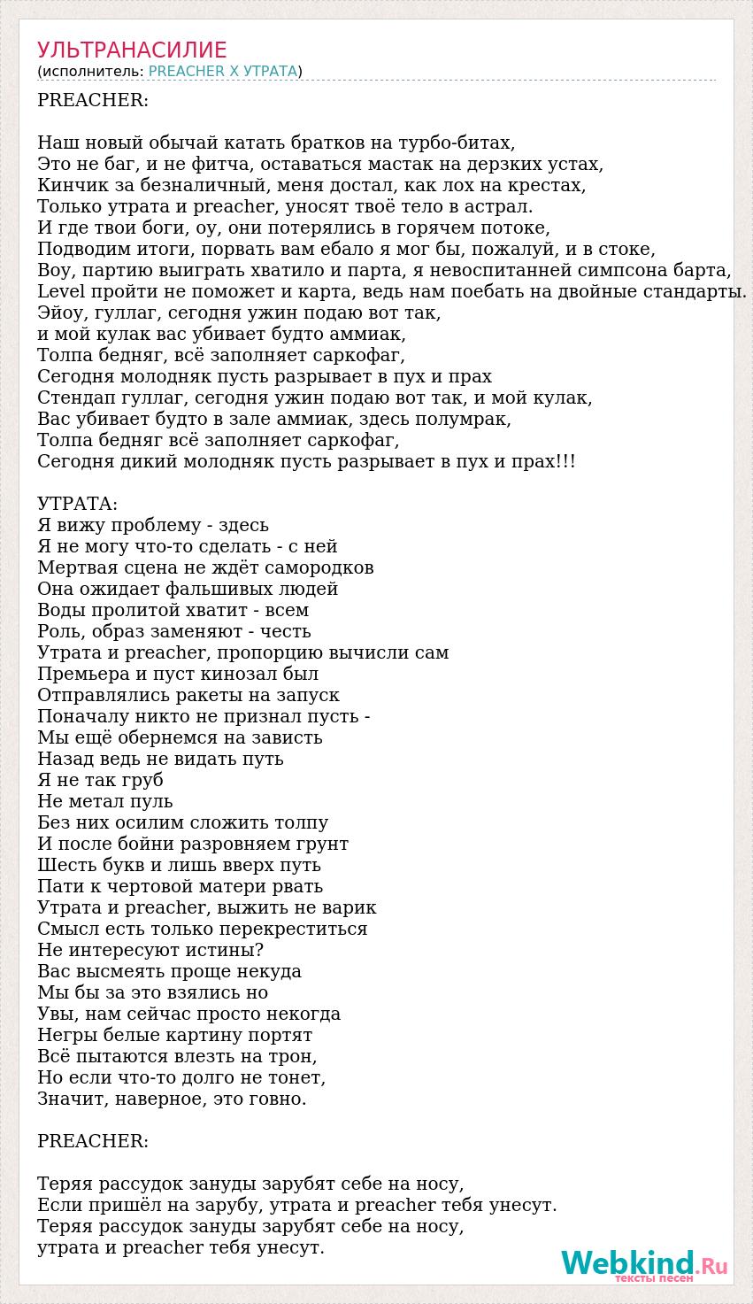 PREACHER: Наш новый обычай катать братков на турбо-битах, Это не баг, и не фитча, оставаться мастак на дерзких устах, Кинчик за безналичный, меня достал, как лох на крестах, Только утрата и preacher, уносят твоё тело в астрал. И где твои боги, оу, они потерялись в горячем потоке, Подводим итоги, порвать вам ебало я мог бы, пожалуй, и в стоке, Воу, партию выиграть хватило и парта, я невоспитанней симпсона барта, Level пройти не поможет и карта, ведь нам поебать на двойные стандарты. Эйоу, гуллаг, сегодня ужин подаю вот так, и мой кулак вас убивает будто аммиак, Толпа бедняг, всё заполняет саркофаг, Сегодня молодняк пусть разрывает в пух и прах Стендап гуллаг, сегодня ужин подаю вот так, и мой кулак, Вас убивает будто в зале аммиак, здесь полумрак, Толпа бедняг всё заполняет саркофаг, Сегодня дикий молодняк пусть разрывает в пух и прах!!! УТРАТА: Я вижу проблему - здесь Я не могу что-то сделать - с ней Мертвая сцена не ждёт самородков Она ожидает фальшивых людей Воды пролитой хватит - всем Роль, образ заменяют - честь Утрата и preacher, пропорцию вычисли сам Премьера и пуст кинозал был Отправлялись ракеты на запуск Поначалу никто не признал пусть - Мы ещё обернемся на зависть Назад ведь не видать путь Я не так груб Не метал пуль Без них осилим сложить толпу И после бойни разровняем грунт Шесть букв и лишь вверх путь Пати к чертовой матери рвать Утрата и preacher, выжить не варик Смысл есть только перекреститься Не интересуют истины? Вас высмеять проще некуда Мы бы за это взялись но Увы, нам сейчас просто некогда Негры белые картину портят Всё пытаются влезть на трон, Но если что-то долго не тонет, Значит, наверное, это говно. PREACHER: Теряя рассудок зануды зарубят себе на носу, Если пришёл на зарубу, утрата и preacher тебя унесут. Теряя рассудок зануды зарубят себе на носу, утрата и preacher тебя унесут.