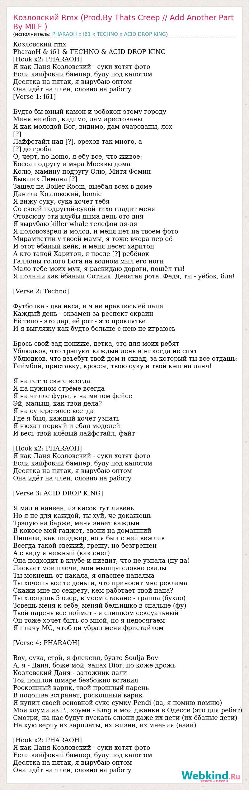 Козловский rmx PharaoH & i61 & TECHNO & ACID DROP KING [Hook x2: PHARAOH] Я как Даня Козловский - суки хотят фото Если кайфовый бампер, буду под капотом Десятка на пятак, я вырубаю оптом Она идёт на член, словно на работу [Verse 1: i61] Будто бы юный камон и робокоп этому городу Меня не ебет, видимо, дам арестованы Я как молодой Бог, видимо, дам очарованы, лох [?] Лайфстайл над [?], орехов так много, а [?] до гроба О, черт, no homo, я ебу все, что живое: Босса подругу и мэра Москвы дома Колю, мамину подругу Олю, Митя Фомин Бывших Димана [?] Зашел на Boiler Room, выебал всех в доме Данила Козловский, homie Я вижу суку, сука хочет тебя Со своей подругой-сукой тихо гладит меня Отовсюду эти клубы дыма день ото дня Я вырубаю killer whale телефон ля-ля Я половоззрел и молод, и меня нет на твоем фото Мирамистин у твоей мамы, я тоже вчера пер её И этот ёбаный кейк, и меня несет харитон А кто такой Харитон, я после [?] ребёнок Галлоны голого Бога на водном мыл его ноги Мало тебе моих мук, я раскидаю дороги, пошёл ты! Я полный как ёбаный Сотник, Девятая рота, Федя, ты - уёбок, бля! [Verse 2: Techno] Футболка - два икса, и я не нравлюсь её папе Каждый день - экзамен за респект окраин Её тело - это дар, её рот - это проклятье И я выгляжу как будто больше с нею не играюсь Брось свой зад пониже, детка, это для моих ребят Ублюдков, что трэпуют каждый день и никогда не спят Ублюдков, что взъебут твой дом и сквад, за который ты все отдашь: Геймбой, приставку, кроссы, твою суку и твой кэш на ланч! Я на гетто свэге всегда Я на нужном стрёме всегда Я на чилле фуры, я на милом фейсе Эй, малыш, как твои дела? Я на суперстэлсе всегда Где я был, каждый хочет узнать Я нюхал первый и ебал моделей И весь твой клёвый лайфстайл, файт [Hook x2: PHARAOH] Я как Даня Козловский - суки хотят фото Если кайфовый бампер, буду под капотом Десятка на пятак, я вырубаю оптом Она идёт на член, словно на работу [Verse 3: ACID DROP KING] Я мал и наивен, из кисок тут ливень Но я не для каждой, ты хуй, че докажешь Трэпую на барже, меня знает каждый В кокосе мой гаджет, звони на домашний Пищала, как пейджер, но я был с ней вежлив Всегда такой свежий, грешу, но безгрешен А с виду я нежный (как снег) Она подходит в клубе и пиздит, что не узнала (ну да) Ласкает мои плечи, мои мышцы словно скалы Ты мокнешь от накала, я опаснее напалма Ты хочешь все те деньги, что приносит мне реклама Скажи мне по секрету, кем работает твой папа? Ты хлещешь 5 озер, в моем стакане - граппа (бухло) Зовешь меня к себе, меняй бельишко в спальне (фу) Твой парень все поймет - я слишком сексуальный Он тоже хочет быть со мной, но я недосягаем Я плачу MC, чтоб он убрал меня фристайлом [Verse 4: PHARAOH] Воу, сука, стой, я флексил, будто Soulja Boy А, я - Даня, боже мой, запах Dior, по коже дрожь Козловский Даня - заложник лали Той пошлой шмаре безбожно вставил Роскошный варик, твой прошлый парень В подошве встрянет, роскошный варик Я купил своей основной суке сумку Fendi (да, я помню-помню) Мой хоуми из P., хоуми - King и мой джанки в Одессе (это для ребят) Смотри, на нас будут пускать слюни даже их дети (их ёбаные дети) На хую верчу их зарплаты, их жизни, их мнения (ааай) [Hook x2: PHARAOH] Я как Даня Козловский - суки хотят фото Если кайфовый бампер, буду под капотом Десятка на пятак, я вырубаю оптом Она идёт на член, словно на работу