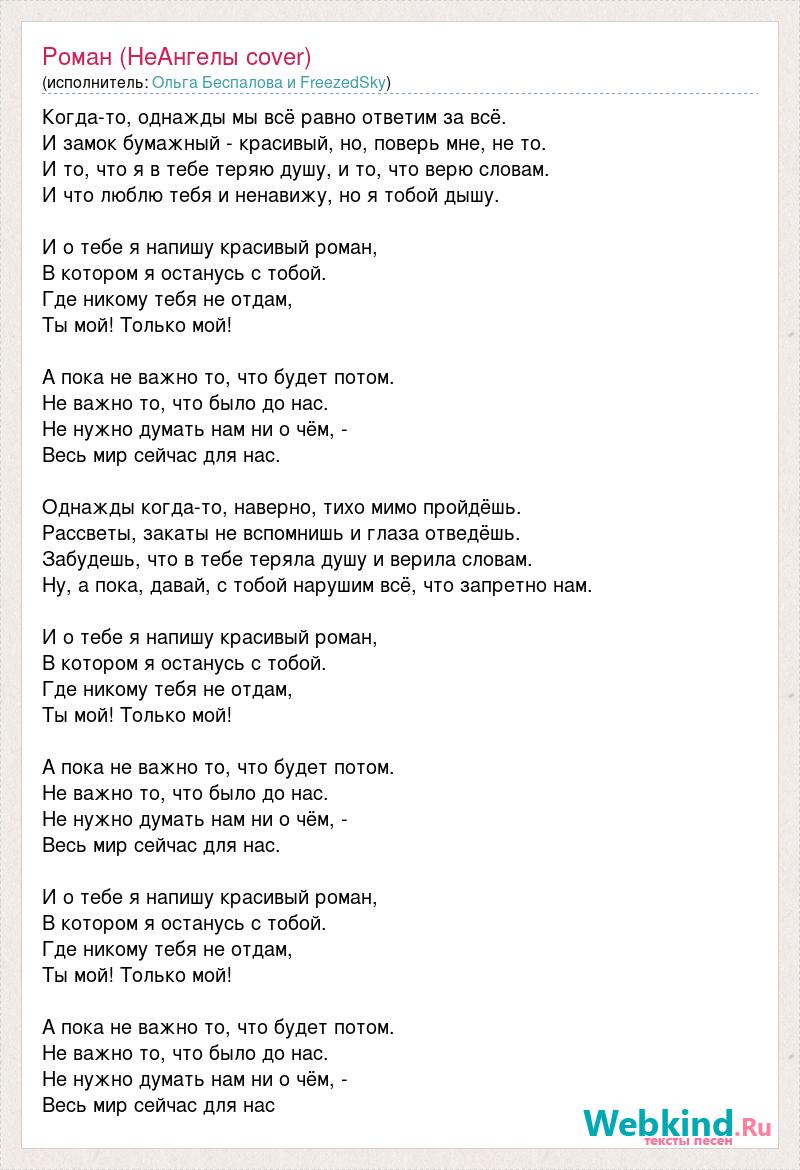Когда-то, однажды мы всё равно ответим за всё. И замок бумажный - красивый, но, поверь мне, не то. И то, что я в тебе теряю душу, и то, что верю словам. И что люблю тебя и ненавижу, но я тобой дышу. И о тебе я напишу красивый роман, В котором я останусь с тобой. Где никому тебя не отдам, Ты мой! Только мой! А пока не важно то, что будет потом. Не важно то, что было до нас. Не нужно думать нам ни о чём, - Весь мир сейчас для нас. Однажды когда-то, наверно, тихо мимо пройдёшь. Рассветы, закаты не вспомнишь и глаза отведёшь. Забудешь, что в тебе теряла душу и верила словам. Ну, а пока, давай, с тобой нарушим всё, что запретно нам. И о тебе я напишу красивый роман, В котором я останусь с тобой. Где никому тебя не отдам, Ты мой! Только мой! А пока не важно то, что будет потом. Не важно то, что было до нас. Не нужно думать нам ни о чём, - Весь мир сейчас для нас. И о тебе я напишу красивый роман, В котором я останусь с тобой. Где никому тебя не отдам, Ты мой! Только мой! А пока не важно то, что будет потом. Не важно то, что было до нас. Не нужно думать нам ни о чём, - Весь мир сейчас для нас