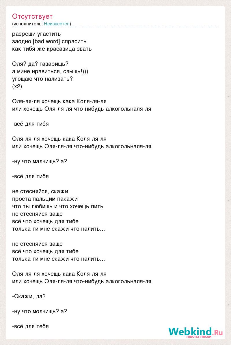 разрещи угастить заодно [bad word] спрасить как тибя же красавица звать Оля? да? гаварищь? а мине нравиться, слыщь!))) угощаю что наливать? (х2) Оля-ля-ля хочещь кака Коля-ля-ля или хочещь Оля-ля-ля что-нибудь алкогольналя-ля -всё для тибя Оля-ля-ля хочещь кака Коля-ля-ля или хочещь Оля-ля-ля что-нибудь алкогольналя-ля -ну что малчищь? а? -всё для тибя не стесняйся, скажи проста пальцим пакажи что ты любищь и что хочещь пить не стесняйся ваще всё что хочещь для тибе толька ти мне скажи что налить... не стесняйся ваще всё что хочещь для тибе толька ти мне скажи что налить... Оля-ля-ля хочещь кака Коля-ля-ля или хочещь Оля-ля-ля что-нибудь алкогольналя-ля -Скажи, да? -ну что молчищь? а? -всё для тебя