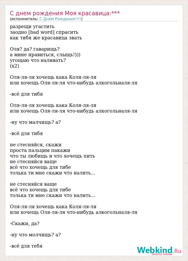 разрещи угастить заодно [bad word] спрасить как тибя же красавица звать Оля? да? гаварищь? а мине нравиться, слыщь!))) угощаю что наливать? (х2) Оля-ля-ля хочещь кака Коля-ля-ля или хочещь Оля-ля-ля что-нибудь алкогольналя-ля -всё для тибя Оля-ля-ля хочещь кака Коля-ля-ля или хочещь Оля-ля-ля что-нибудь алкогольналя-ля -ну что малчищь? а? -всё для тибя не стесняйся, скажи проста пальцим пакажи что ты любищь и что хочещь пить не стесняйся ваще всё что хочещь для тибе толька ти мне скажи что налить... не стесняйся ваще всё что хочещь для тибе толька ти мне скажи что налить... Оля-ля-ля хочещь кака Коля-ля-ля или хочещь Оля-ля-ля что-нибудь алкогольналя-ля -Скажи, да? -ну что молчищь? а? -всё для тебя