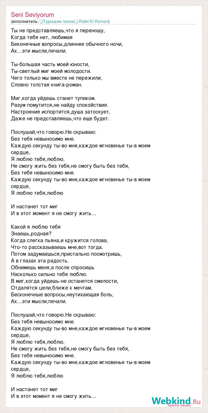 Ты не представляешь,что я переношу, Когда тебя нет, любимая Беконечные вопросы,длиннее обычного ночи, Ах…эти мысли,печали. Ты-большая часть моей юности, Ты-светлый миг моей молодости. Чего только мы вместе не пережили, Словно толстая книга-роман. Миг,когда уйдешь станет тупиком. Разум помутится,не найду спокойствия. Настроение испортится,душа затоскует, Даже не представляешь,что еще будет. Послушай,что говорю.Не скрываю: Без тебя невыносимо мне. Каждую секунду ты-во мне,каждое мгновенье ты-в моем сердце, Я люблю тебя,люблю. Не смогу жить без тебя,не смогу быть без тебя, Без тебя невыносимо мне. Каждую секунду ты-во мне,каждое мгновенье ты-в моем сердце, Я люблю тебя,люблю И настанет тот миг И в этот момент я не смогу жить… Какой я люблю тебя Знаешь,родная? Когда слегка пьяна,и кружится голова, Что-то рассказываешь мне,вот тогда. Потом задумаешься,пристально посмотришь, А в глазах эта радость. Обнимешь меня,а после спросишь Насколько сильно тебя люблю. В миг,когда уйдешь-не останется смелости, Отдалятся цели,ближе к мечтам. Бесконечные вопросы,неутихающая боль, Ах…эти мысли,печали. Послушай,что говорю.Не скрываю: Без тебя невыносимо мне. Каждую секунду ты-во мне,каждое мгновенье ты-в моем сердце, Я люблю тебя,люблю. Не смогу жить без тебя,не смогу быть без тебя, Без тебя невыносимо мне. Каждую секунду ты-во мне,каждое мгновенье ты-в моем сердце, Я люблю тебя,люблю И настанет тот миг И в этот момент я не смогу жить…