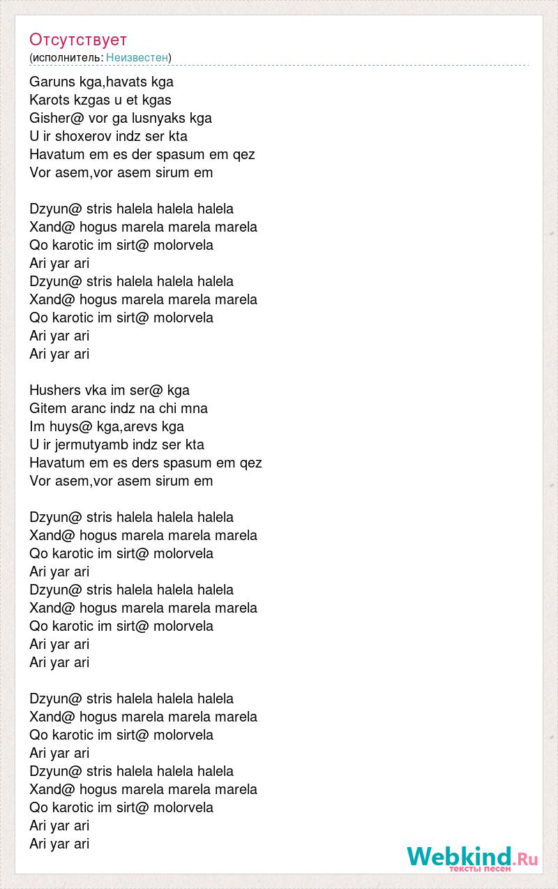 Garuns kga,havats kga Karots kzgas u et kgas Gisher@ vor ga lusnyaks kga U ir shoxerov indz ser kta Havatum em es der spasum em qez Vor asem,vor asem sirum em Dzyun@ stris halela halela halela Xand@ hogus marela marela marela Qo karotic im sirt@ molorvela Ari yar ari Dzyun@ stris halela halela halela Xand@ hogus marela marela marela Qo karotic im sirt@ molorvela Ari yar ari Ari yar ari Hushers vka im ser@ kga Gitem aranc indz na chi mna Im huys@ kga,arevs kga U ir jermutyamb indz ser kta Havatum em es ders spasum em qez Vor asem,vor asem sirum em Dzyun@ stris halela halela halela Xand@ hogus marela marela marela Qo karotic im sirt@ molorvela Ari yar ari Dzyun@ stris halela halela halela Xand@ hogus marela marela marela Qo karotic im sirt@ molorvela Ari yar ari Ari yar ari Dzyun@ stris halela halela halela Xand@ hogus marela marela marela Qo karotic im sirt@ molorvela Ari yar ari Dzyun@ stris halela halela halela Xand@ hogus marela marela marela Qo karotic im sirt@ molorvela Ari yar ari Ari yar ari