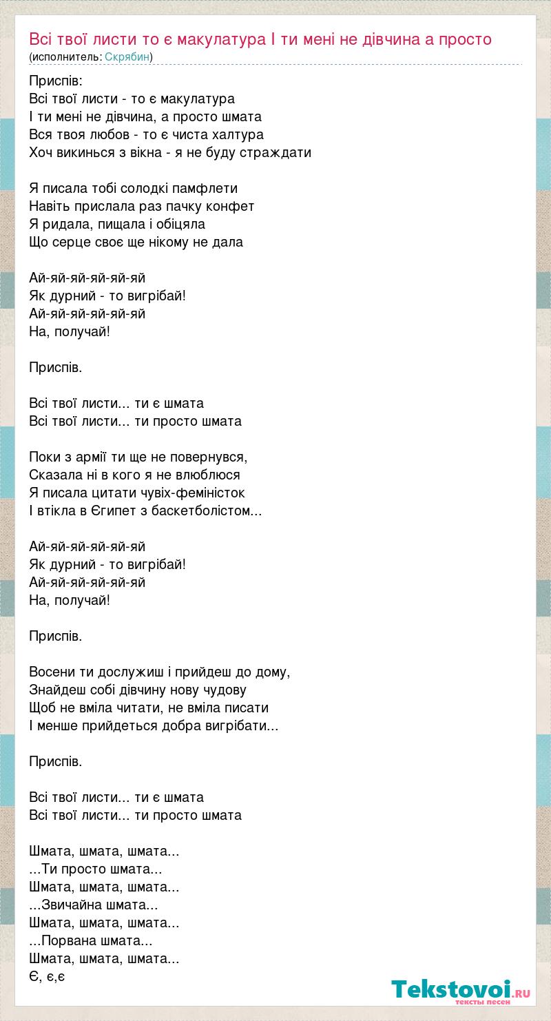 Приспів: Всі твої листи - то є макулатура І ти мені не дівчина, а просто шмата Вся твоя любов - то є чиста халтура Хоч викинься з вікна - я не буду страждати Я писала тобі солодкі памфлети Навіть прислала раз пачку конфет Я ридала, пищала і обіцяла Що серце своє ще нікому не дала Ай-яй-яй-яй-яй-яй Як дурний - то вигрібай! Ай-яй-яй-яй-яй-яй На, получай! Приспів. Всі твої листи... ти є шмата Всі твої листи... ти просто шмата Поки з армії ти ще не повернувся, Сказала ні в кого я не влюблюся Я писала цитати чувіх-феміністок І втікла в Єгипет з баскетболістом... Ай-яй-яй-яй-яй-яй Як дурний - то вигрібай! Ай-яй-яй-яй-яй-яй На, получай! Приспів. Восени ти дослужиш і прийдеш до дому, Знайдеш собі дівчину нову чудову Щоб не вміла читати, не вміла писати І менше прийдеться добра вигрібати... Приспів. Всі твої листи... ти є шмата Всі твої листи... ти просто шмата Шмата, шмата, шмата... ...Ти просто шмата... Шмата, шмата, шмата... ...Звичайна шмата... Шмата, шмата, шмата... ...Порвана шмата... Шмата, шмата, шмата... Є, є,є