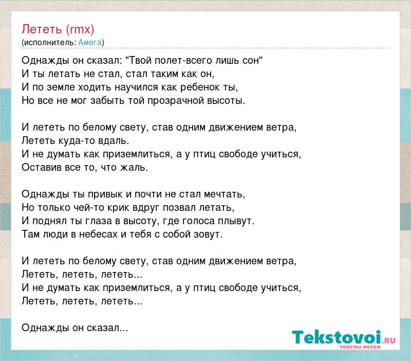 Однажды он сказал: "Твой полет-всего лишь сон" И ты летать не стал, стал таким как он, И по земле ходить научился как ребенок ты, Но все не мог забыть той прозрачной высоты. И лететь по белому свету, став одним движением ветра, Лететь куда-то вдаль. И не думать как приземлиться, а у птиц свободе учиться, Оставив все то, что жаль. Однажды ты привык и почти не стал мечтать, Но только чей-то крик вдруг позвал летать, И поднял ты глаза в высоту, где голоса плывут. Там люди в небесах и тебя с собой зовут. И лететь по белому свету, став одним движением ветра, Лететь, лететь, лететь... И не думать как приземлиться, а у птиц свободе учиться, Лететь, лететь, лететь... Однажды он сказал...