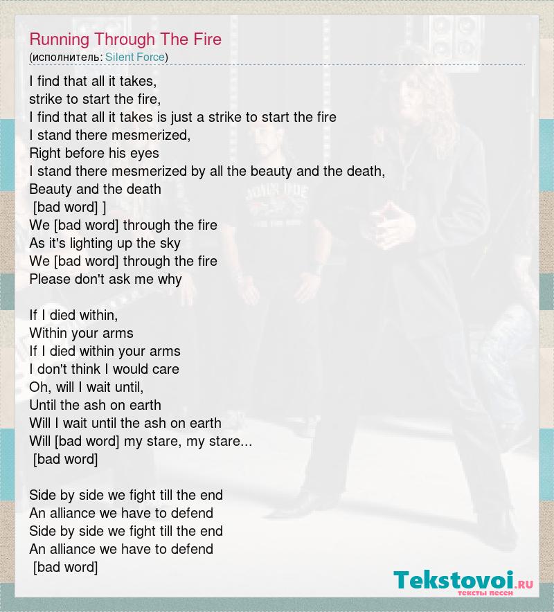 I find that all it takes, strike to start the fire, I find that all it takes is just a strike to start the fire I stand there mesmerized, Right before his eyes I stand there mesmerized by all the beauty and the death, Beauty and the death [Chorus:] We are running through the fire As it's lighting up the sky We are running through the fire Please don't ask me why If I died within, Within your arms If I died within your arms I don't think I would care Oh, will I wait until, Until the ash on earth Will I wait until the ash on earth Will crush my stare, my stare... [Chorus] Side by side we fight till the end An alliance we have to defend Side by side we fight till the end An alliance we have to defend [Chorus]