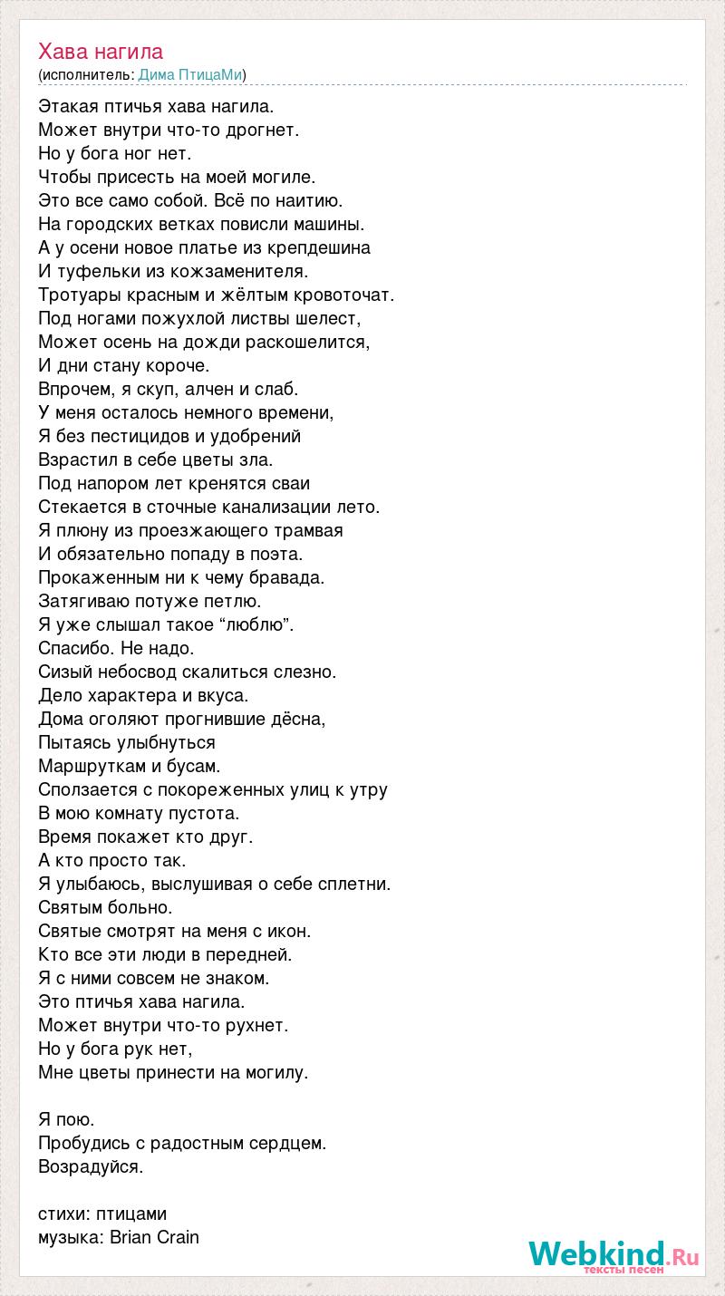Этакая птичья хава нагила. Может внутри что-то дрогнет. Но у бога ног нет. Чтобы присесть на моей могиле. Это все само собой. Всё по наитию. На городских ветках повисли машины. А у осени новое платье из крепдешина И туфельки из кожзаменителя. Тротуары красным и жёлтым кровоточат. Под ногами пожухлой листвы шелест, Может осень на дожди раскошелится, И дни стану короче. Впрочем, я скуп, алчен и слаб. У меня осталось немного времени, Я без пестицидов и удобрений Взрастил в себе цветы зла. Под напором лет кренятся сваи Стекается в сточные канализации лето. Я плюну из проезжающего трамвая И обязательно попаду в поэта. Прокаженным ни к чему бравада. Затягиваю потуже петлю. Я уже слышал такое “люблю”. Спасибо. Не надо. Сизый небосвод скалиться слезно. Дело характера и вкуса. Дома оголяют прогнившие дёсна, Пытаясь улыбнуться Маршруткам и бусам. Сползается с покореженных улиц к утру В мою комнату пустота. Время покажет кто друг. А кто просто так. Я улыбаюсь, выслушивая о себе сплетни. Святым больно. Святые смотрят на меня с икон. Кто все эти люди в передней. Я с ними совсем не знаком. Это птичья хава нагила. Может внутри что-то рухнет. Но у бога рук нет, Мне цветы принести на могилу. Я пою. Пробудись с радостным сердцем. Возрадуйся. стихи: птицами музыка: Brian Crain