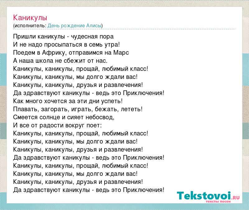 Пришли каникулы - чудесная пора И не надо просыпаться в семь утра! Поедем в Африку, отправимся на Марс А наша школа не сбежит от нас. Каникулы, каникулы, прощай, любимый класс! Каникулы, каникулы, мы долго ждали вас! Каникулы, каникулы, друзья и развлечения! Да здравствуют каникулы - ведь это Приключения! Как много хочется за эти дни успеть! Плавать, загорать, играть, бежать, лететь! Смеется солнце и сияет небосвод, И все от радости вокруг поет: Каникулы, каникулы, прощай, любимый класс! Каникулы, каникулы, мы долго ждали вас! Каникулы, каникулы, друзья и развлечения! Да здравствуют каникулы - ведь это Приключения! Каникулы, каникулы, прощай, любимый класс! Каникулы, каникулы, мы долго ждали вас! Каникулы, каникулы, друзья и развлечения! Да здравствуют каникулы - ведь это Приключения!