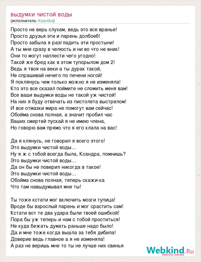 Просто не верь слухам, ведь это все вранье! Просто друзья эти и парень долбоеб! Просто забыла я разгладить эти простыни! А ты мне сразу в челюсть и ни во что не вник! Они то могут наплести чего угодно! Такой же бред как в этом тупорылом дом 2! Ведь я твоя на веки а ты дурак такой, Не спрашивай нечего по печени ногой! Я поклянусь чем только можно я не изменяла! Кто это все сказал поймите не сломить меня вам! Все ваши выдумки воды не такой уж чистой! На них я буду отвечать из пистолета выстрелом! И все отмазки мира не помогут вам сейчас! Обойма снова полная, а значит пробил час Ваших смертей пускай я не имею члена, Но говорю вам прямо что я его клала на вас! Да я клянусь, не говорил я всего этого! Это выдумки чистой воды… Ну я ж с тобой всегда была, Ксандра, помнишь? Это выдумки чистой воды… Да он бы не поверил никогда в такое! Это выдумки чистой воды… Обойма снова полная, теперь скажи-ка Что там навыдумывал мне ты! Ты тоже кстати мог включить мозги тупица! Вроде бы взрослый парень и мог срастить сам! Кстати вот те два удара были твоей ошибкой! Пора бы уж теперь и нам с тобой проститься! Не куда бежать думать раньше надо было! Да и мне тоже когда вышла за тебя дибила! Доверие ведь главное а я не изменяла! А раз не веришь мне то ты не лучше них свинья