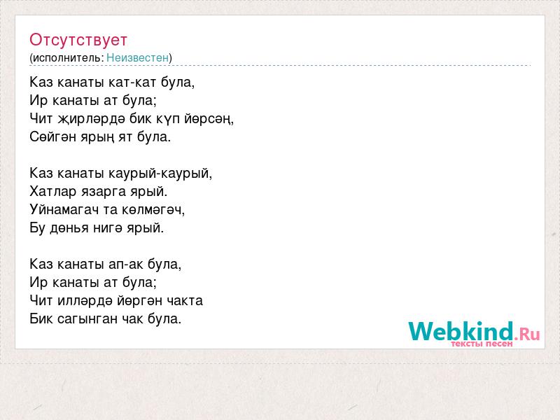 Каз канаты кат-кат була, Ир канаты ат була; Чит җирләрдә бик күп йөрсәң, Сөйгән ярың ят була. Каз канаты каурый-каурый, Хатлар язарга ярый. Уйнамагач та көлмәгәч, Бу дөнья нигә ярый. Каз канаты ап-ак була, Ир канаты ат була; Чит илләрдә йөргән чакта Бик сагынган чак була.
