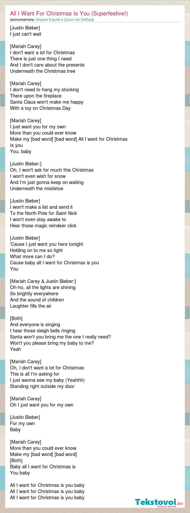 [Justin Bieber] I just can't wait [Mariah Carey] I don't want a lot for Christmas There is just one thing I need And I don't care about the presents Underneath the Christmas tree [Mariah Carey] I don't need to hang my stocking There upon the fireplace Santa Claus won't make me happy With a toy on Christmas Day [Mariah Carey] I just want you for my own More than you could ever know Make my wish come true All I want for Christmas Is you You, baby [Justin Bieber:] Oh, I won't ask for much this Christmas I won't even wish for snow And I'm just gonna keep on waiting Underneath the mistletoe [Justin Bieber] I won't make a list and send it To the North Pole for Saint Nick I won't even stay awake to Hear those magic reindeer click [Justin Bieber] 'Cause I just want you here tonight Holding on to me so tight What more can I do? Cause baby all I want for Christmas is you You [Mariah Carey & Justin Bieber:] Oh-ho, all the lights are shining So brightly everywhere And the sound of children Laughter fills the air [Both] And everyone is singing I hear those sleigh bells ringing Santa won't you bring me the one I really need? Won't you please bring my baby to me? Yeah [Mariah Carey] Oh, I don't want a lot for Christmas This is all I'm asking for I just wanna see my baby (Yeahhh) Standing right outside my door [Mariah Carey] Oh I just want you for my own [Justin Bieber] For my own Baby [Mariah Carey] More than you could ever know Make my wish come true [Both] Baby all I want for Christmas is You baby All I want for Christmas is you baby All I want for Christmas is you baby All I want for Christmas is you baby