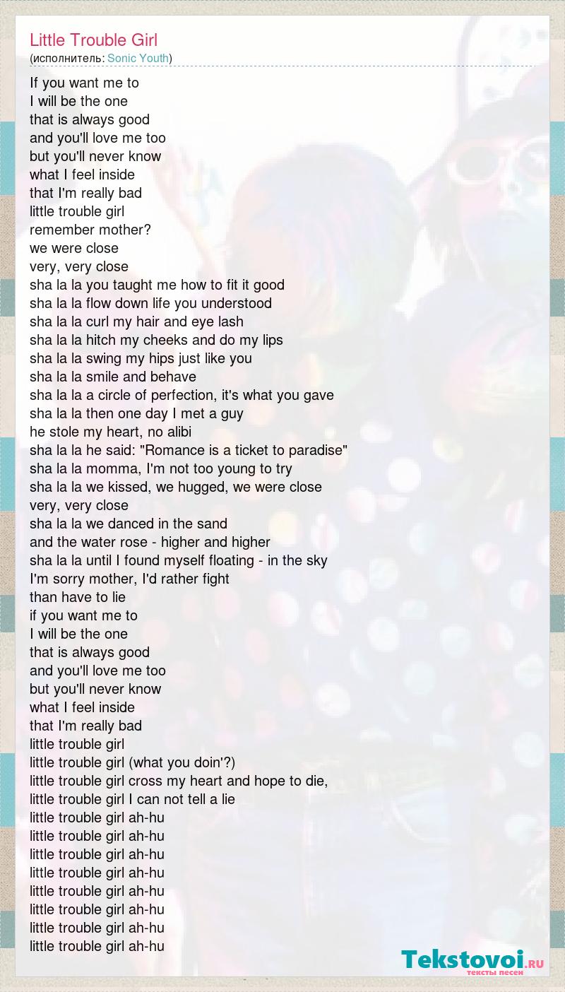If you want me to I will be the one that is always good and you'll love me too but you'll never know what I feel inside that I'm really bad little trouble girl remember mother? we were close very, very close sha la la you taught me how to fit it good sha la la flow down life you understood sha la la curl my hair and eye lash sha la la hitch my cheeks and do my lips sha la la swing my hips just like you sha la la smile and behave sha la la a circle of perfection, it's what you gave sha la la then one day I met a guy he stole my heart, no alibi sha la la he said: "Romance is a ticket to paradise" sha la la momma, I'm not too young to try sha la la we kissed, we hugged, we were close very, very close sha la la we danced in the sand and the water rose - higher and higher sha la la until I found myself floating - in the sky I'm sorry mother, I'd rather fight than have to lie if you want me to I will be the one that is always good and you'll love me too but you'll never know what I feel inside that I'm really bad little trouble girl little trouble girl (what you doin'?) little trouble girl cross my heart and hope to die, little trouble girl I can not tell a lie little trouble girl ah-hu little trouble girl ah-hu little trouble girl ah-hu little trouble girl ah-hu little trouble girl ah-hu little trouble girl ah-hu little trouble girl ah-hu little trouble girl ah-hu