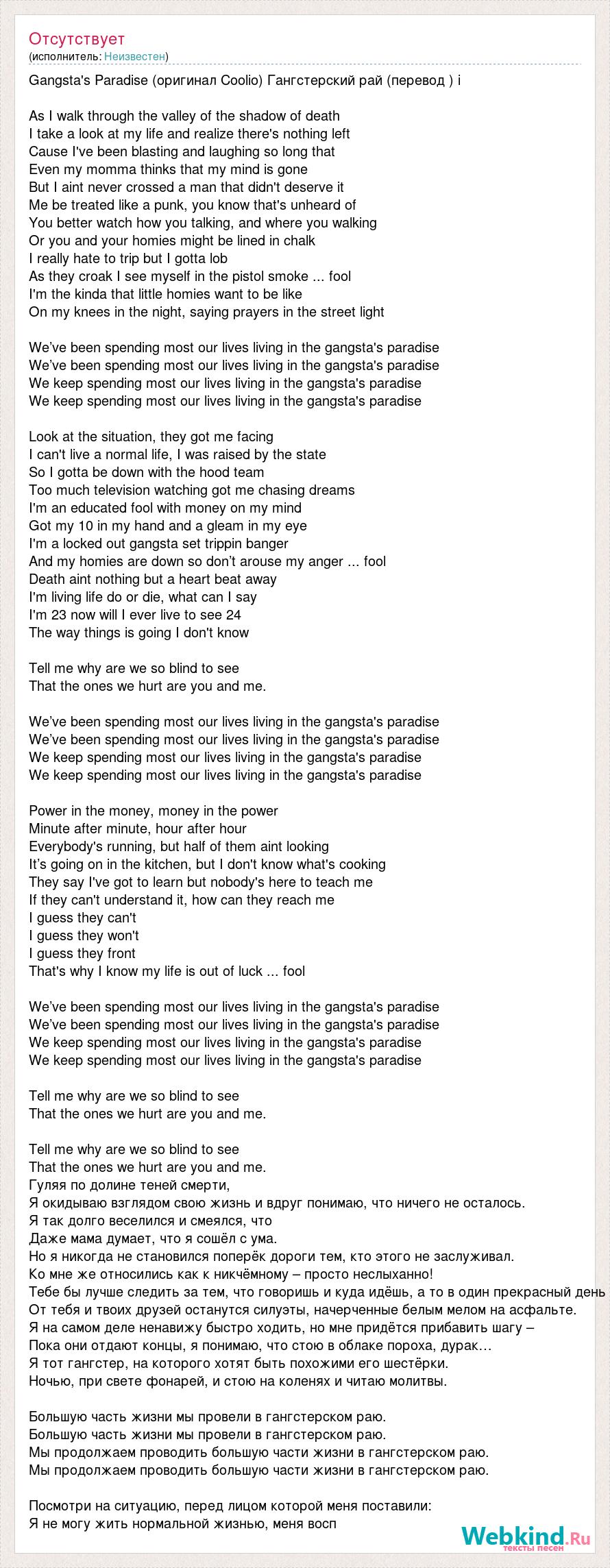 Gangsta's Paradise (оригинал Coolio) Гангстерский рай (перевод ) i As I walk through the valley of the shadow of death I take a look at my life and realize there's nothing left Cause I've been blasting and laughing so long that Even my momma thinks that my mind is gone But I aint never crossed a man that didn't deserve it Me be treated like a punk, you know that's unheard of You better watch how you talking, and where you walking Or you and your homies might be lined in chalk I really hate to trip but I gotta lob As they croak I see myself in the pistol smoke ... fool I'm the kinda that little homies want to be like On my knees in the night, saying prayers in the street light We’ve been spending most our lives living in the gangsta's paradise We’ve been spending most our lives living in the gangsta's paradise We keep spending most our lives living in the gangsta's paradise We keep spending most our lives living in the gangsta's paradise Look at the situation, they got me facing I can't live a normal life, I was raised by the state So I gotta be down with the hood team Too much television watching got me chasing dreams I'm an educated fool with money on my mind Got my 10 in my hand and a gleam in my eye I'm a locked out gangsta set trippin banger And my homies are down so don’t arouse my anger ... fool Death aint nothing but a heart beat away I'm living life do or die, what can I say I'm 23 now will I ever live to see 24 The way things is going I don't know Tell me why are we so blind to see That the ones we hurt are you and me. We’ve been spending most our lives living in the gangsta's paradise We’ve been spending most our lives living in the gangsta's paradise We keep spending most our lives living in the gangsta's paradise We keep spending most our lives living in the gangsta's paradise Power in the money, money in the power Minute after minute, hour after hour Everybody's running, but half of them aint looking It’s going on in the kitchen, but I don't know what's cooking They say I've got to learn but nobody's here to teach me If they can't understand it, how can they reach me I guess they can't I guess they won't I guess they front That's why I know my life is out of luck ... fool We’ve been spending most our lives living in the gangsta's paradise We’ve been spending most our lives living in the gangsta's paradise We keep spending most our lives living in the gangsta's paradise We keep spending most our lives living in the gangsta's paradise Tell me why are we so blind to see That the ones we hurt are you and me. Tell me why are we so blind to see That the ones we hurt are you and me. Гуляя по долине теней смерти, Я окидываю взглядом свою жизнь и вдруг понимаю, что ничего не осталось. Я так долго веселился и смеялся, что Даже мама думает, что я сошёл с ума. Но я никогда не становился поперёк дороги тем, кто этого не заслуживал. Ко мне же относились как к никчёмному – просто неслыханно! Тебе бы лучше следить за тем, что говоришь и куда идёшь, а то в один прекрасный день От тебя и твоих друзей останутся силуэты, начерченные белым мелом на асфальте. Я на самом деле ненавижу быстро ходить, но мне придётся прибавить шагу – Пока они отдают концы, я понимаю, что стою в облаке пороха, дурак… Я тот гангстер, на которого хотят быть похожими его шестёрки. Ночью, при свете фонарей, и стою на коленях и читаю молитвы. Большую часть жизни мы провели в гангстерском раю. Большую часть жизни мы провели в гангстерском раю. Мы продолжаем проводить большую части жизни в гангстерском раю. Мы продолжаем проводить большую части жизни в гангстерском раю. Посмотри на ситуацию, перед лицом которой меня поставили: Я не могу жить нормальной жизнью, меня восп