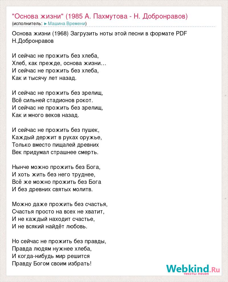 Основа жизни (1968) Загрузить ноты этой песни в формате PDF Н.Добронравов И сейчас не прожить без хлеба, Хлеб, как прежде, основа жизни… И сейчас не прожить без хлеба, Как и тысячу лет назад. И сейчас не прожить без зрелищ, Всё сильней стадионов рокот. И сейчас не прожить без зрелищ, Как и много веков назад. И сейчас не прожить без пушек, Каждый держит в руках оружье, Только вместо пищалей древних Век придумал страшнее смерть. Нынче можно прожить без Бога, И хоть жить без него труднее, Всё же можно прожить без Бога И без древних святых молитв. Можно даже прожить без счастья, Счастья просто на всех не хватит, И не каждый находит счастье, И не всякий найдёт любовь. Но сейчас не прожить без правды, Правда людям нужнее хлеба, И когда-нибудь мир решится Правду Богом своим избрать!