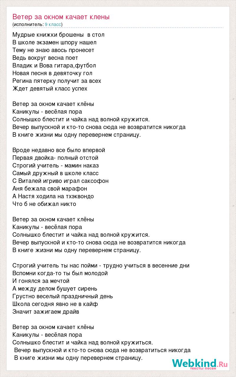 Мудрые книжки брошены в стол В школе экзамен шпору нашел Тему не знаю авось пронесет Ведь вокруг весна поет Владик и Вова гитара,футбол Новая песня в девяточку гол Регина пятерку получит за всех Ждет девятый класс успех Ветер за окном качает клёны Каникулы - весёлая пора Солнышко блестит и чайка над волной кружится. Вечер выпускной и кто-то снова сюда не возвратится никогда В книге жизни мы одну перевернем страницу. Вроде недавно все было впервой Первая двойка- полный отстой Строгий учитель - мамин наказ Самый дружный в школе класс С Виталей игриво играл саксофон Аня бежала свой марафон А Настя ходила на тхэквондо Что б не обижал никто Ветер за окном качает клёны Каникулы - весёлая пора Солнышко блестит и чайка над волной кружится. Вечер выпускной и кто-то снова сюда не возвратится никогда В книге жизни мы одну перевернем страницу. Строгий учитель ты нас пойми - трудно учиться в весенние дни Вспомни когда-то ты был молодой И гонялся за мечтой А между делом бушует сирень Грустно веселый праздничный день Школа сегодня явно не в кайф Значит зажигаем драйв Ветер за окном качает клёны Каникулы - весёлая пора Солнышко блестит и чайка над волной кружиться. Вечер выпускной и кто-то снова сюда не возвратиться никогда В книге жизни мы одну перевернем страницу.