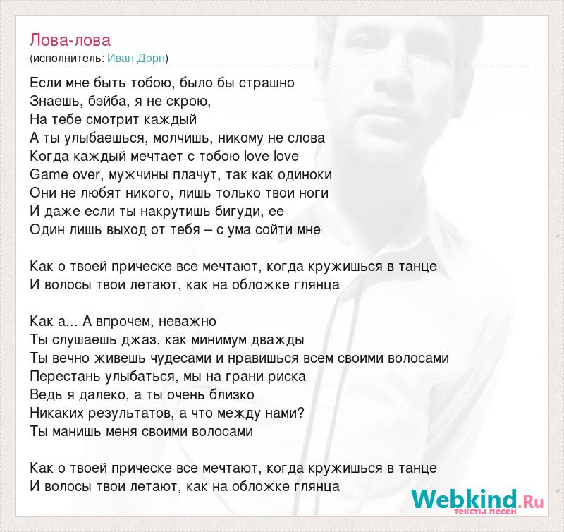 Если мне быть тобою, было бы страшно Знаешь, бэйба, я не скрою, На тебе смотрит каждый А ты улыбаешься, молчишь, никому не слова Когда каждый мечтает с тобою love love Game over, мужчины плачут, так как одиноки Они не любят никого, лишь только твои ноги И даже если ты накрутишь бигуди, ее Один лишь выход от тебя – с ума сойти мне Как о твоей прическе все мечтают, когда кружишься в танце И волосы твои летают, как на обложке глянца Как а... А впрочем, неважно Ты слушаешь джаз, как минимум дважды Ты вечно живешь чудесами и нравишься всем своими волосами Перестань улыбаться, мы на грани риска Ведь я далеко, а ты очень близко Никаких результатов, а что между нами? Ты манишь меня своими волосами Как о твоей прическе все мечтают, когда кружишься в танце И волосы твои летают, как на обложке глянца