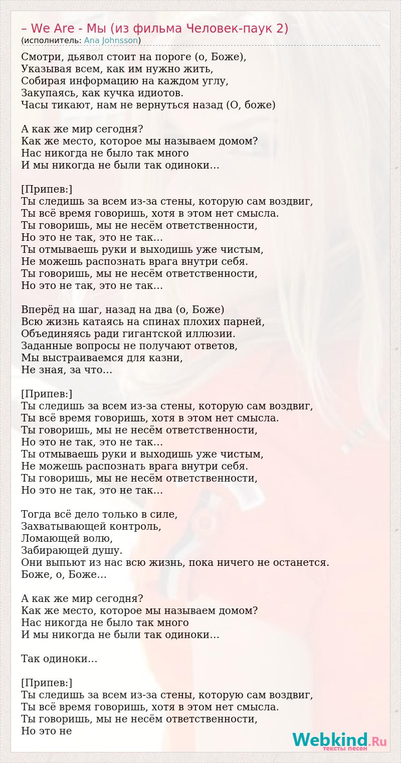 А как ты думаешь, о чем песня "– We Are - Мы (из фильма Человек-паук 2)" ?