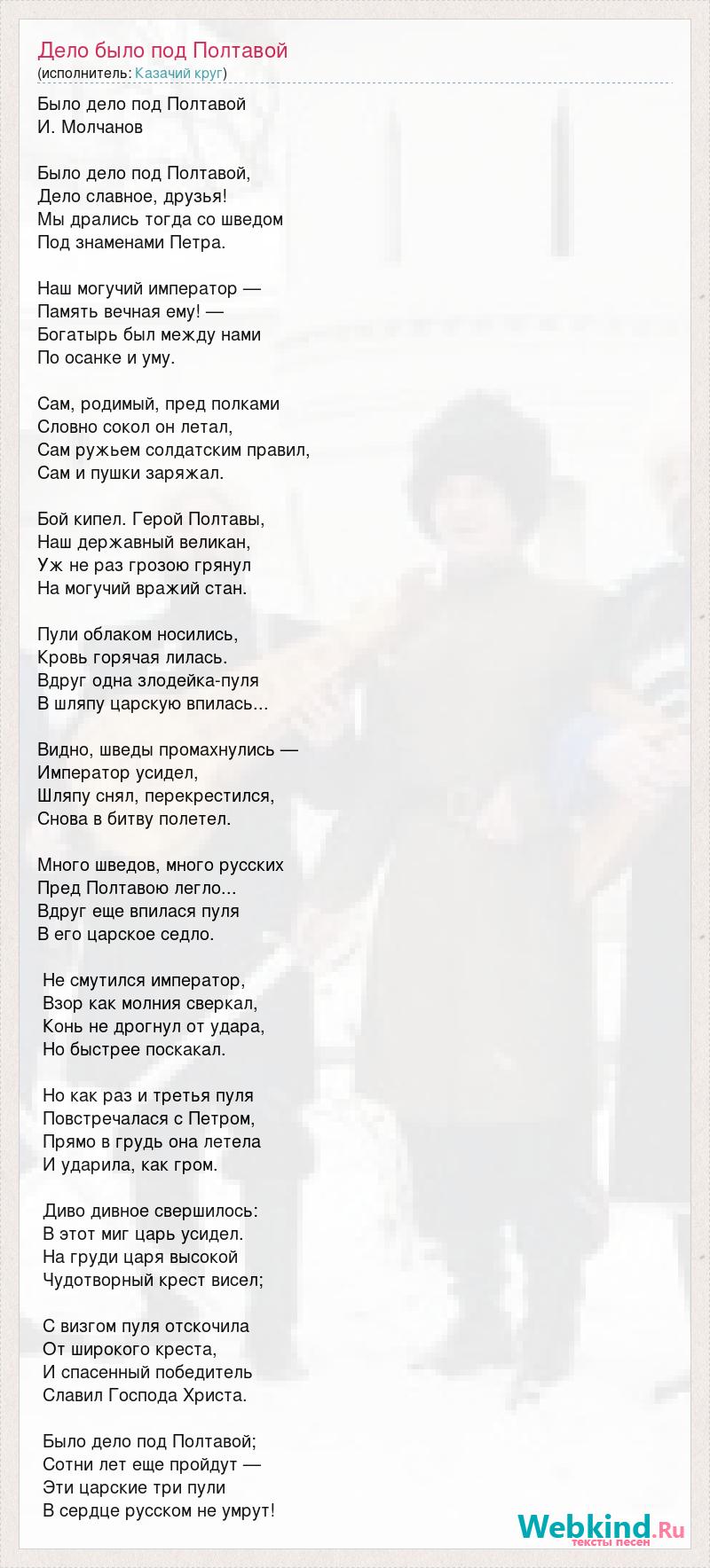 Было дело под Полтавой И. Молчанов Было дело под Полтавой, Дело славное, друзья! Мы дрались тогда со шведом Под знаменами Петра. Наш могучий император — Память вечная ему! — Богатырь был между нами По осанке и уму. Сам, родимый, пред полками Словно сокол он летал, Сам ружьем солдатским правил, Сам и пушки заряжал. Бой кипел. Герой Полтавы, Наш державный великан, Уж не раз грозою грянул На могучий вражий стан. Пули облаком носились, Кровь горячая лилась. Вдруг одна злодейка-пуля В шляпу царскую впилась... Видно, шведы промахнулись — Император усидел, Шляпу снял, перекрестился, Снова в битву полетел. Много шведов, много русских Пред Полтавою легло... Вдруг еще впилася пуля В его царское седло. Не смутился император, Взор как молния сверкал, Конь не дрогнул от удара, Но быстрее поскакал. Но как раз и третья пуля Повстречалася с Петром, Прямо в грудь она летела И ударила, как гром. Диво дивное свершилось: В этот миг царь усидел. На груди царя высокой Чудотворный крест висел; С визгом пуля отскочила От широкого креста, И спасенный победитель Славил Господа Христа. Было дело под Полтавой; Сотни лет еще пройдут — Эти царские три пули В сердце русском не умрут!