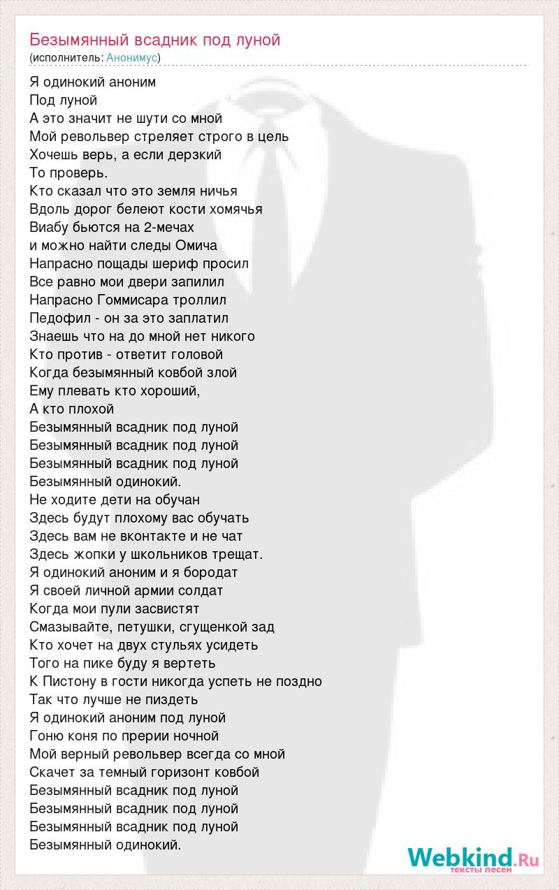Я одинокий аноним Под луной А это значит не шути со мной Мой револьвер стреляет строго в цель Хочешь верь, а если дерзкий То проверь. Кто сказал что это земля ничья Вдоль дорог белеют кости хомячья Виабу бьются на 2-мечах и можно найти следы Омича Напрасно пощады шериф просил Все равно мои двери запилил Напрасно Гоммисара троллил Педофил - он за это заплатил Знаешь что на до мной нет никого Кто против - ответит головой Когда безымянный ковбой злой Ему плевать кто хороший, А кто плохой Безымянный всадник под луной Безымянный всадник под луной Безымянный всадник под луной Безымянный одинокий. Не ходите дети на обучан Здесь будут плохому вас обучать Здесь вам не вконтакте и не чат Здесь жопки у школьников трещат. Я одинокий аноним и я бородат Я своей личной армии солдат Когда мои пули засвистят Смазывайте, петушки, сгущенкой зад Кто хочет на двух стульях усидеть Того на пике буду я вертеть К Пистону в гости никогда успеть не поздно Так что лучше не пиздеть Я одинокий аноним под луной Гоню коня по прерии ночной Мой верный револьвер всегда со мной Скачет за темный горизонт ковбой Безымянный всадник под луной Безымянный всадник под луной Безымянный всадник под луной Безымянный одинокий.