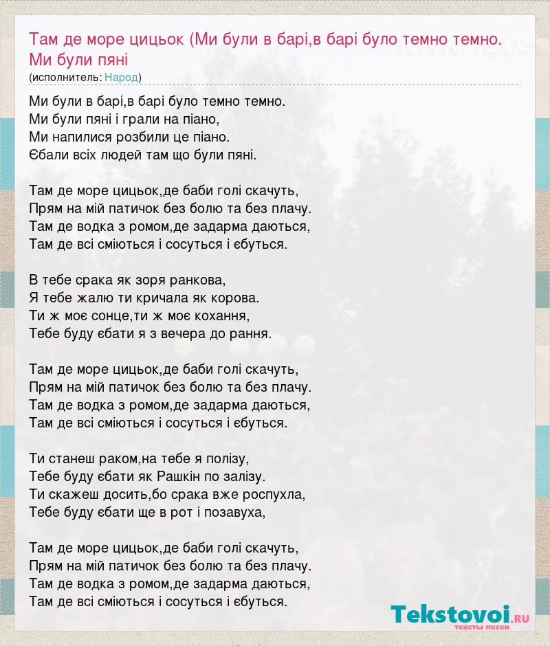 Ми були в барі,в барі було темно темно. Ми були пяні і грали на піано, Ми напилися розбили це піано. Єбали всіх людей там що були пяні. Там де море цицьок,де баби голі скачуть, Прям на мій патичок без болю та без плачу. Там де водка з ромом,де задарма даються, Там де всі сміються і сосуться і єбуться. В тебе срака як зоря ранкова, Я тебе жалю ти кричала як корова. Ти ж моє сонце,ти ж моє кохання, Тебе буду єбати я з вечера до рання. Там де море цицьок,де баби голі скачуть, Прям на мій патичок без болю та без плачу. Там де водка з ромом,де задарма даються, Там де всі сміються і сосуться і єбуться. Ти станеш раком,на тебе я полізу, Тебе буду єбати як Рашкін по залізу. Ти скажеш досить,бо срака вже роспухла, Тебе буду єбати ще в рот і позавуха, Там де море цицьок,де баби голі скачуть, Прям на мій патичок без болю та без плачу. Там де водка з ромом,де задарма даються, Там де всі сміються і сосуться і єбуться.
