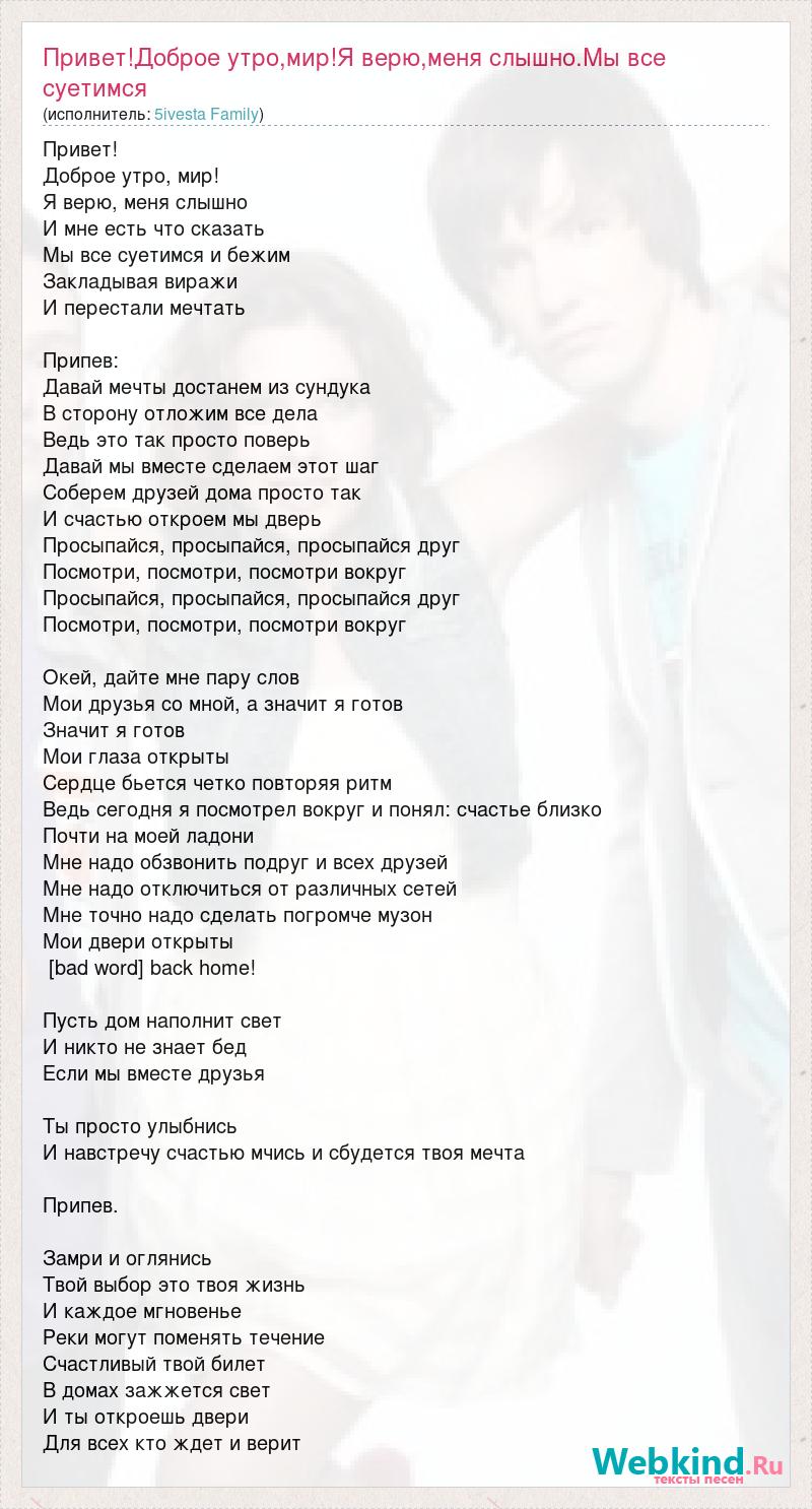 Привет! Доброе утро, мир! Я верю, меня слышно И мне есть что сказать Мы все суетимся и бежим Закладывая виражи И перестали мечтать Припев: Давай мечты достанем из сундука В сторону отложим все дела Ведь это так просто поверь Давай мы вместе сделаем этот шаг Соберем друзей дома просто так И счастью откроем мы дверь Просыпайся, просыпайся, просыпайся друг Посмотри, посмотри, посмотри вокруг Просыпайся, просыпайся, просыпайся друг Посмотри, посмотри, посмотри вокруг Окей, дайте мне пару слов Мои друзья со мной, а значит я готов Значит я готов Мои глаза открыты Сердце бьется четко повторяя ритм Ведь сегодня я посмотрел вокруг и понял: счастье близко Почти на моей ладони Мне надо обзвонить подруг и всех друзей Мне надо отключиться от различных сетей Мне точно надо сделать погромче музон Мои двери открыты [bad word] back home! Пусть дом наполнит свет И никто не знает бед Если мы вместе друзья Ты просто улыбнись И навстречу счастью мчись и сбудется твоя мечта Припев. Замри и оглянись Твой выбор это твоя жизнь И каждое мгновенье Реки могут поменять течение Счастливый твой билет В домах зажжется свет И ты откроешь двери Для всех кто ждет и верит
