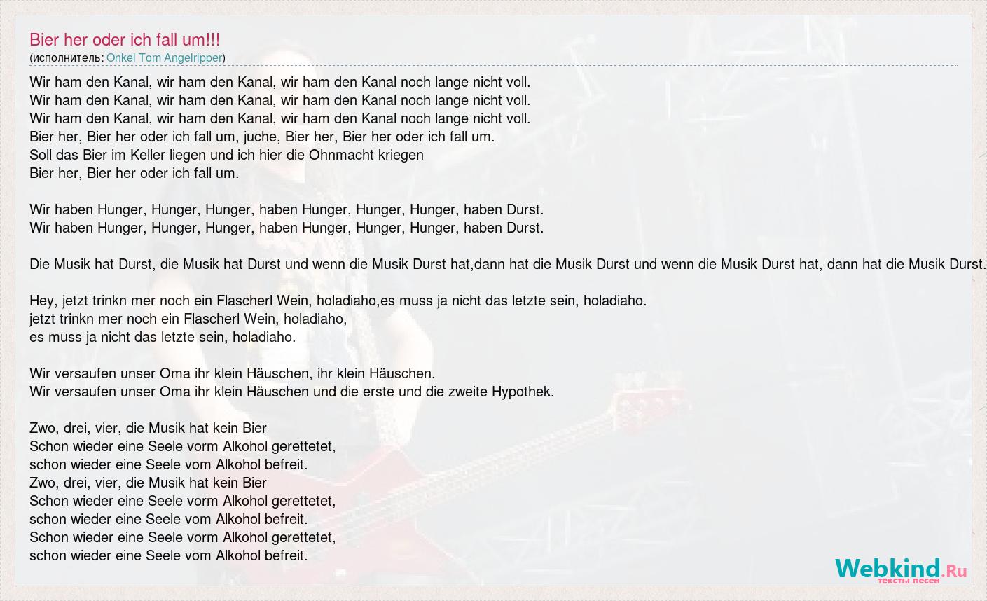 Wir ham den Kanal, wir ham den Kanal, wir ham den Kanal noch lange nicht voll. Wir ham den Kanal, wir ham den Kanal, wir ham den Kanal noch lange nicht voll. Wir ham den Kanal, wir ham den Kanal, wir ham den Kanal noch lange nicht voll. Bier her, Bier her oder ich fall um, juche, Bier her, Bier her oder ich fall um. Soll das Bier im Keller liegen und ich hier die Ohnmacht kriegen Bier her, Bier her oder ich fall um. Wir haben Hunger, Hunger, Hunger, haben Hunger, Hunger, Hunger, haben Durst. Wir haben Hunger, Hunger, Hunger, haben Hunger, Hunger, Hunger, haben Durst. Die Musik hat Durst, die Musik hat Durst und wenn die Musik Durst hat,dann hat die Musik Durst und wenn die Musik Durst hat, dann hat die Musik Durst. Hey, jetzt trinkn mer noch ein Flascherl Wein, holadiaho,es muss ja nicht das letzte sein, holadiaho. jetzt trinkn mer noch ein Flascherl Wein, holadiaho, es muss ja nicht das letzte sein, holadiaho. Wir versaufen unser Oma ihr klein Häuschen, ihr klein Häuschen. Wir versaufen unser Oma ihr klein Häuschen und die erste und die zweite Hypothek. Zwo, drei, vier, die Musik hat kein Bier Schon wieder eine Seele vorm Alkohol gerettetet, schon wieder eine Seele vom Alkohol befreit. Zwo, drei, vier, die Musik hat kein Bier Schon wieder eine Seele vorm Alkohol gerettetet, schon wieder eine Seele vom Alkohol befreit. Schon wieder eine Seele vorm Alkohol gerettetet, schon wieder eine Seele vom Alkohol befreit.
