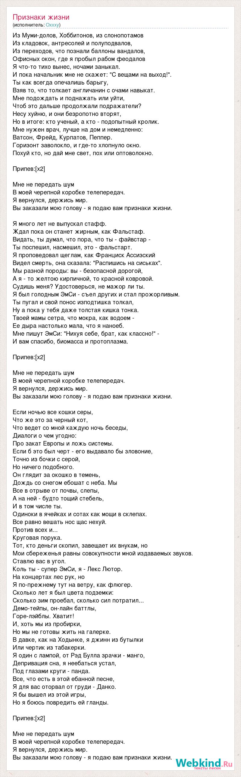 Из Муми-долов, Хоббитонов, из слонопотамов Из кладовок, антресолей и полуподвалов, Из переходов, что познали баллоны вандалов, Офисных окон, где я пробыл рабом феодалов Я что-то тихо вынес, ночами заныкал. И пока начальник мне не скажет: "С вещами на выход!". Ты как всегда опечалишь барыгу, Взяв то, что толкает англичанин с очами навыкат. Мне подождать и поднажать или уйти, Чтоб это дальше продолжали подражатели? Несу хуйню, и они безропотно вторят, Но в итоге: кто ученый, а кто - подопытный кролик. Мне нужен врач, лучше на дом и немедленно: Ватсон, Фрейд, Курпатов, Пеппер. Горизонт заволокло, и где-то хлопнуло окно. Похуй кто, но дай мне свет, пох или оптоволокно. Припев:[x2] Мне не передать шум В моей черепной коробке телепередач. Я вернулся, держись мир. Вы заказали мою голову - я подаю вам признаки жизни. Я много лет не выпускал стафф. Ждал пока он станет жирным, как Фальстаф. Видать, ты думал, что пора, что ты - файвстар - Ты поспешил, насмешил, это - фальстарт. Я проповедовал щеглам, как Франциск Ассизский Видел смерть, она сказала: "Распишись на сиськах". Мы разной породы: вы - безопасной дорогой, А я - то желтою кирпичной, то красной ковровой. Судишь меня? Удостоверься, не мажор ли ты. Я был голодным ЭмСи - съел других и стал прожорливым. Ты пугал и свой понос изподтишка толкал, Ну а пока у тебя даже толстая кишка тонка. Твоей мамы сетра, что мокра, как водоем - Ее дыра настолько мала, что я наноеб. Мне пишут ЭмСи: "Нихуя себе, брат, как классно!" - И вам спасибо, биомасса и протоплазма. Припев:[x2] Мне не передать шум В моей черепной коробке телепередач. Я вернулся, держись мир. Вы заказали мою голову - я подаю вам признаки жизни. Если ночью все кошки серы, Что же это за черный кот, Что ведет со мной каждую ночь беседы, Диалоги о чем угодно: Про закат Европы и ложь системы. Если б это был черт - его выдавало бы зловоние, Точно из бочки с серой, Но ничего подобного. Он глядит за окошко в темень, Дождь со снегом ебошат с неба. Мы Все в отрыве от почвы, слепы, А на ней - будто тощий стебель, И в том числе ты. Одиноки в ячейках и сотах как мощи в склепах. Все равно вешать нос щас нехуй. Против всех и... Круговая порука. Тот, кто деньги скопил, завещает их внукам, но Мои сбереженья равны совокупности мной издаваемых звуков. Ставлю вас в угол. Коль ты - супер ЭмСи, я - Лекс Лютор. На концертах лес рук, но Я по-прежнему тут на ветру, как флюгер. Сколько лет я был цвета подземки: Сколько зим проебал, сколько сил потратил... Демо-тейпы, он-лайн баттлы, Горе-лэйблы. Хватит! И, хоть мы из пробирки, Но мы не готовы жить на галерке. В давке, как на Ходынке, я джинн из бутылки Или чертик из табакерки. Я один с лампой, от Рэд Булла зрачки - манго, Депривация сна, я неебаться устал, Под глазами круги - панда. Все, что есть в этой ебанной песне, Я для вас оторвал от груди - Данко. Я бы вышел из этой игры, Но я боюсь повредить ей гланды. Припев:[x2] Мне не передать шум В моей черепной коробке телепередач. Я вернулся, держись мир. Вы заказали мою голову - я подаю вам признаки жизни.