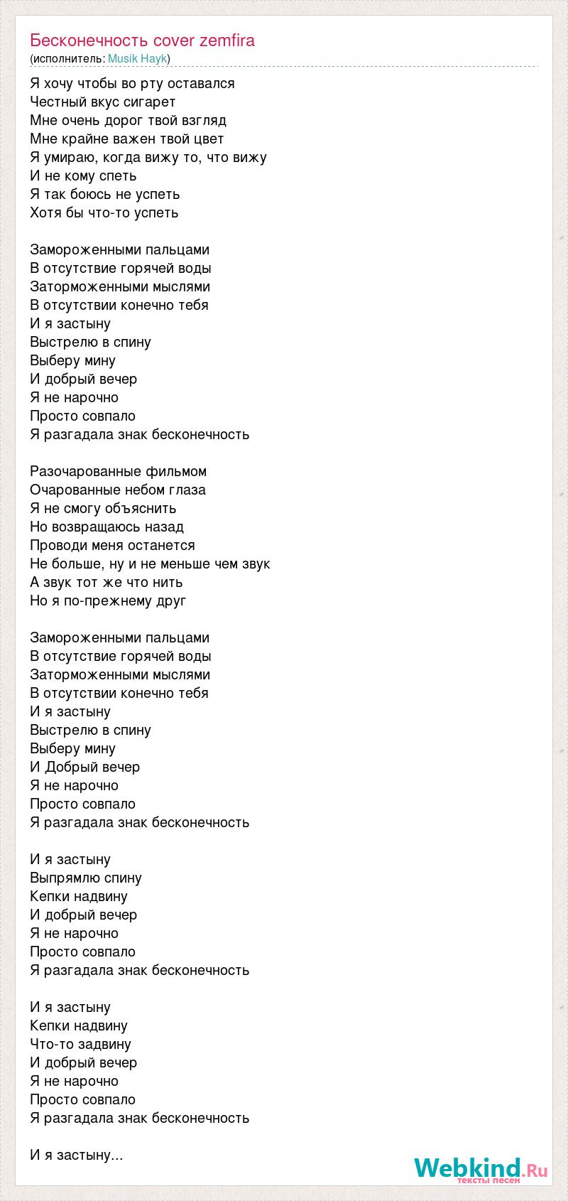 Я хочу чтобы во рту оставался Честный вкус сигарет Мне очень дорог твой взгляд Мне крайне важен твой цвет Я умираю, когда вижу то, что вижу И не кому спеть Я так боюсь не успеть Хотя бы что-то успеть Замороженными пальцами В отсутствие горячей воды Заторможенными мыслями В отсутствии конечно тебя И я застыну Выстрелю в спину Выберу мину И добрый вечер Я не нарочно Просто совпало Я разгадала знак бесконечность Разочарованные фильмом Очарованные небом глаза Я не смогу объяснить Но возвращаюсь назад Проводи меня останется Не больше, ну и не меньше чем звук А звук тот же что нить Но я по-прежнему друг Замороженными пальцами В отсутствие горячей воды Заторможенными мыслями В отсутствии конечно тебя И я застыну Выстрелю в спину Выберу мину И Добрый вечер Я не нарочно Просто совпало Я разгадала знак бесконечность И я застыну Выпрямлю спину Кепки надвину И добрый вечер Я не нарочно Просто совпало Я разгадала знак бесконечность И я застыну Кепки надвину Что-то задвину И добрый вечер Я не нарочно Просто совпало Я разгадала знак бесконечность И я застыну...