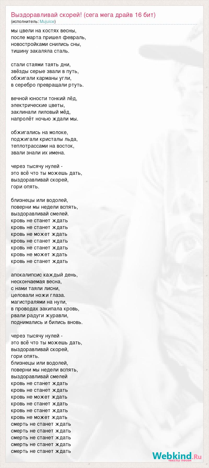мы цвели на костях весны, после марта пришел февраль, новостройками снились сны, тишину закаляла сталь. стали стаями таять дни, звёзды серые звали в путь, обжигали карманы угли, в серебро превращали ртуть. вечной юности тонкий лёд, электрические цветы, заклинали лиловый мёд, напролёт ночью ждали мы. обжигались на молоке, поджигали кристалы льда, теплотрассами на восток, звали знали их имена. через тысячу нулей - это всё что ты можешь дать, выздоравливай скорей, гори опять. близнецы или водолей, поверни мы недели вспять, выздоравливай смелей. кровь не станет ждать кровь не станет ждать кровь не может ждать кровь не станет ждать кровь не станет ждать кровь не может ждать кровь не станет ждать апокалипсис каждый день, нескончаемая весна, с нами таяли лисни, целовали ножи глаза. магистралями на нули, в проводах закипала кровь, рвали радуги журавли, поднимались и бились вновь. через тысячу нулей - это всё что ты можешь дать, выздоравливай скорей, гори опять. близнецы или водолей, поверни мы недели вспять, выздоравливай смелей кровь не станет ждать кровь не станет ждать кровь не может ждать кровь не станет ждать кровь не станет ждать кровь не может ждать смерть не станет ждать смерть не станет ждать смерть не станет ждать смерть не станет ждать смерть не станет ждать
