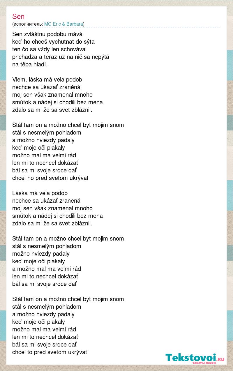 Sen zvláštnu podobu mává keď ho chceš vychutnať do sýta ten čo sa vždy len schovával prichadza a teraz už na nič sa nepýtá na těba hladí. Viem, láska má vela podob nechce sa ukázať zraněná moj sen však znamenal mnoho smútok a nádej si chodili bez mena zdalo sa mi že sa svet zbláznil. Stál tam on a možno chcel byt mojim snom stál s nesmelým pohladom a možno hviezdy padaly keď moje oči plakaly možno mal ma velmi rád len mi to nechcel dokázať bál sa mi svoje srdce dať chcel ho pred svetom ukrývat Láska má vela podob nechce sa ukázať zranená moj sen však znamenal mnoho smútok a nádej si chodili bez mena zdalo sa mi že sa svet zbláznil. Stál tam on a možno chcel byt mojim snom stál s nesmelým pohladom možno hviezdy padaly keď moje oči plakaly a možno mal ma velmi rád len mi to nechcel dokázať bál sa mi svoje srdce dať Stál tam on a možno chcel byt mojim snom stál s nesmelým pohladom a možno hviezdy padaly keď moje oči plakaly možno mal ma velmi rád len mi to nechcel dokázať bál sa mi svoje srdce dať chcel to pred svetom ukrývat