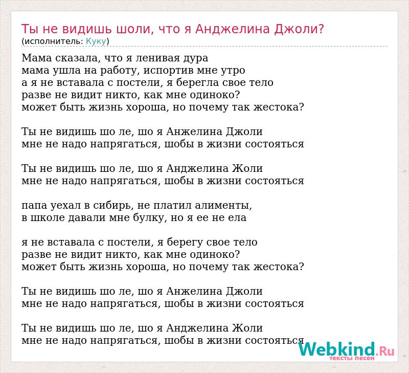 Мама сказала, что я ленивая дура мама ушла на работу, испортив мне утро а я не вставала с постели, я берегла свое тело разве не видит никто, как мне одиноко? может быть жизнь хороша, но почему так жестока? Ты не видишь шо ле, шо я Анжелина Джоли мне не надо напрягаться, шобы в жизни состояться Ты не видишь шо ле, шо я Анджелина Жоли мне не надо напрягаться, шобы в жизни состояться папа уехал в сибирь, не платил алименты, в школе давали мне булку, но я ее не ела я не вставала с постели, я берегу свое тело разве не видит никто, как мне одиноко? может быть жизнь хороша, но почему так жестока? Ты не видишь шо ле, шо я Анжелина Джоли мне не надо напрягаться, шобы в жизни состояться Ты не видишь шо ле, шо я Анджелина Жоли мне не надо напрягаться, шобы в жизни состояться