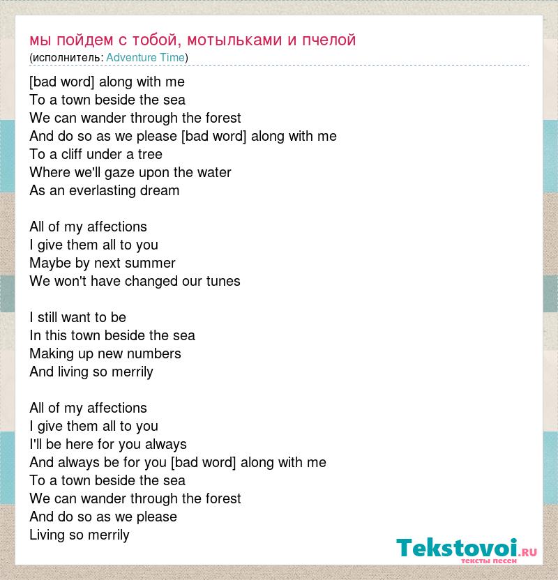 Come along with me To a town beside the sea We can wander through the forest And do so as we please Come along with me To a cliff under a tree Where we'll gaze upon the water As an everlasting dream All of my affections I give them all to you Maybe by next summer We won't have changed our tunes I still want to be In this town beside the sea Making up new numbers And living so merrily All of my affections I give them all to you I'll be here for you always And always be for you Come along with me To a town beside the sea We can wander through the forest And do so as we please Living so merrily