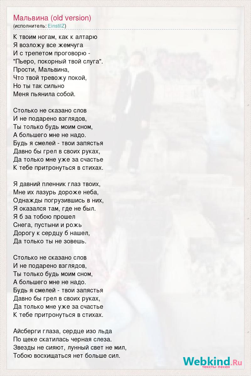 К твоим ногам, как к алтарю Я возложу все жемчуга И с трепетом проговорю - "Пьеро, покорный твой слуга". Прости, Мальвина, Что твой тревожу покой, Но ты так сильно Меня пьянила собой. Столько не сказано слов И не подарено взглядов, Ты только будь моим сном, А большего мне не надо. Будь я смелей - твои запястья Давно бы грел в своих руках, Да только мне уже за счастье К тебе притронуться в стихах. Я давний пленник глаз твоих, Мне их лазурь дороже неба, Однажды погрузившись в них, Я оказался там, где не был. Я б за тобою прошел Снега, пустыни и рожь Дорогу к сердцу б нашел, Да только ты не зовешь. Столько не сказано слов И не подарено взглядов, Ты только будь моим сном, А большего мне не надо. Будь я смелей - твои запястья Давно бы грел в своих руках, Да только мне уже за счастье К тебе притронуться в стихах. Айсберги глаза, сердце изо льда По щеке скатилась черная слеза. Звезды не сияют, лунный свет не мил, Тобою восхищаться нет больше сил.